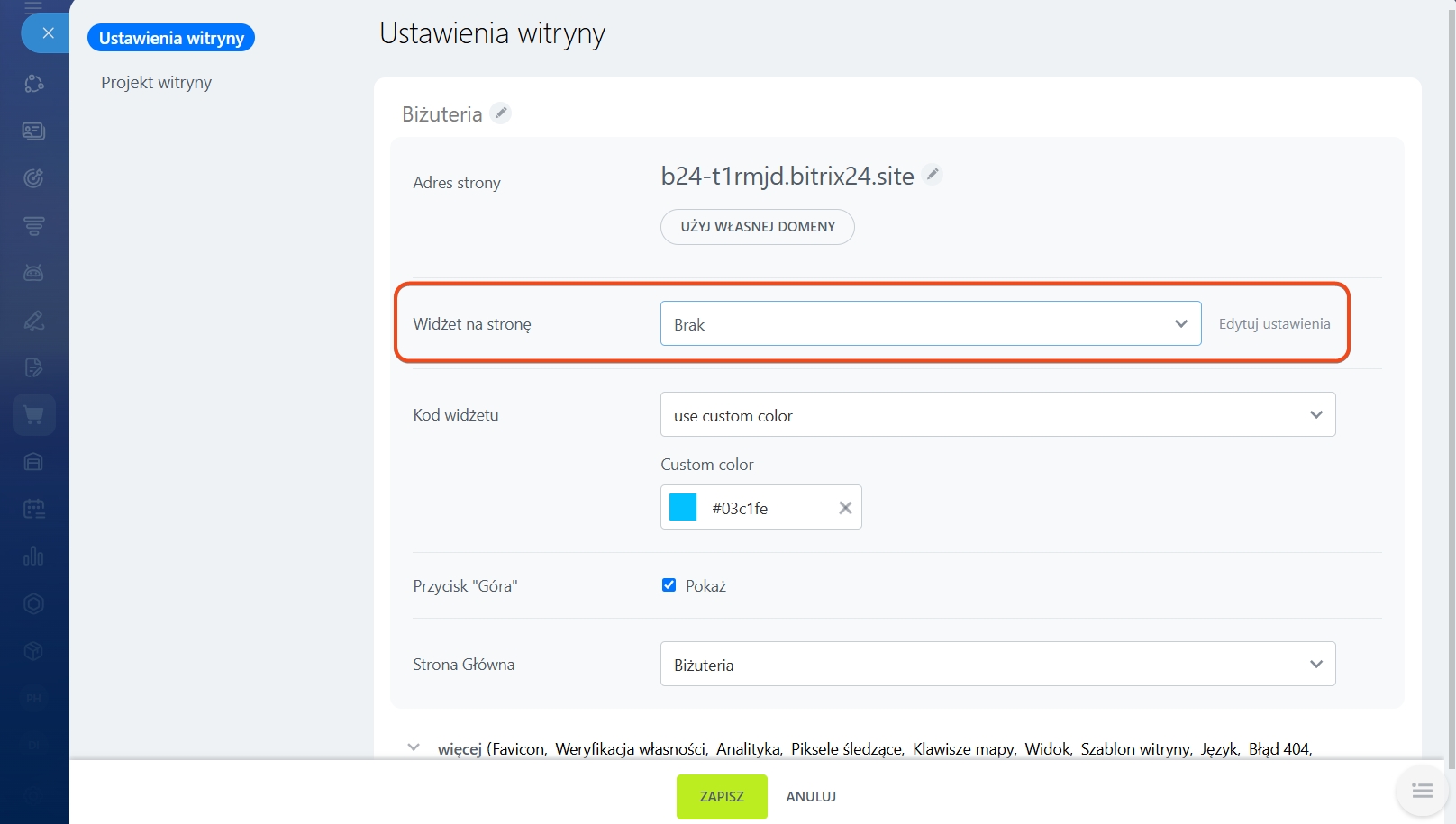 W sekcji Widżet na stronie kliknij listę rozwijaną, wybierz opcję Brak i zapisz zmiany.