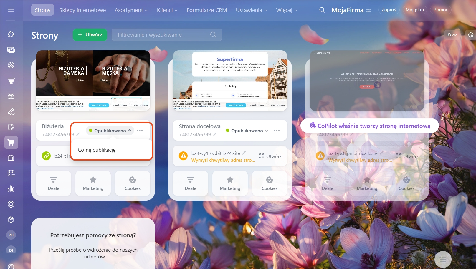 Ta opcja jest odpowiednia dla witryny Bitrix24 i systemów CMS innych firm. Wyłączenie widżetu spowoduje usunięcie go ze wszystkich witryn, w tym z systemów CMS innych firm, na których widżet jest zainstalowany. Po aktywacji widżet pojawi się ponownie we wszystkich witrynach.