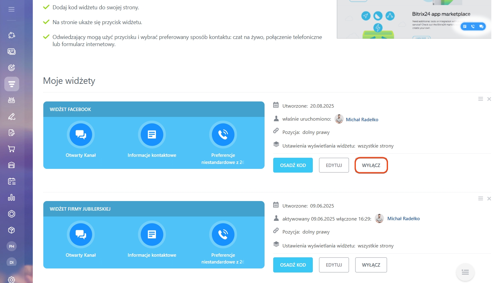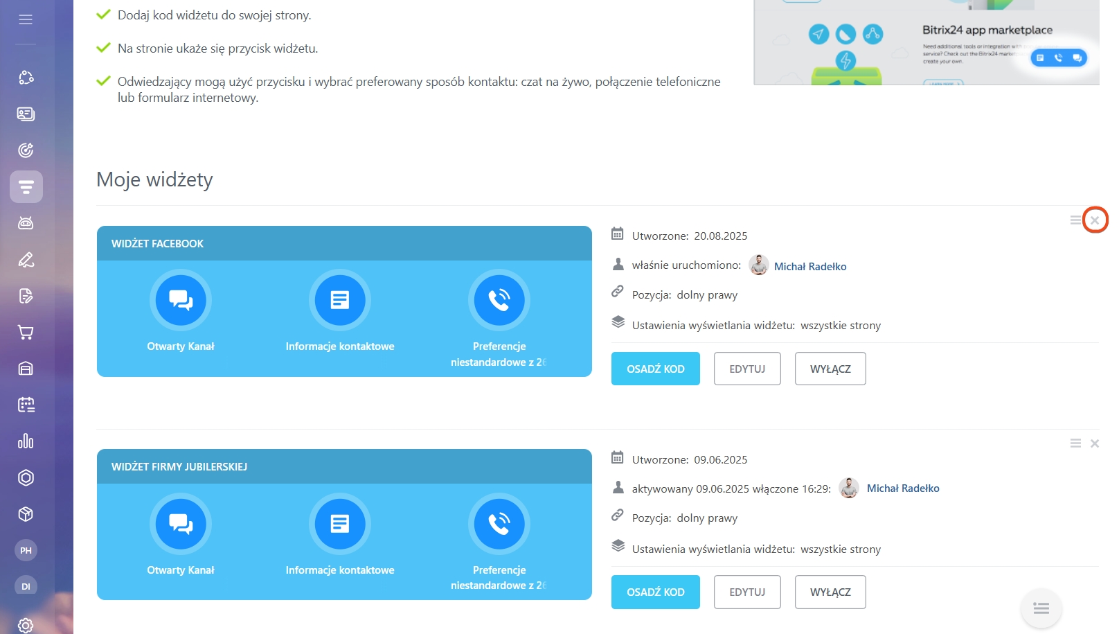 Korzystając z tej opcji, całkowicie usuniesz widżet ze swojego konta Bitrix24 i wszelkich witryn, na których jest zainstalowany.