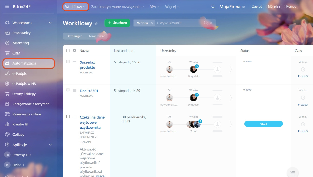 Możesz skonfigurować procesy biznesowe w sekcji Automatyzacja> Workflow.