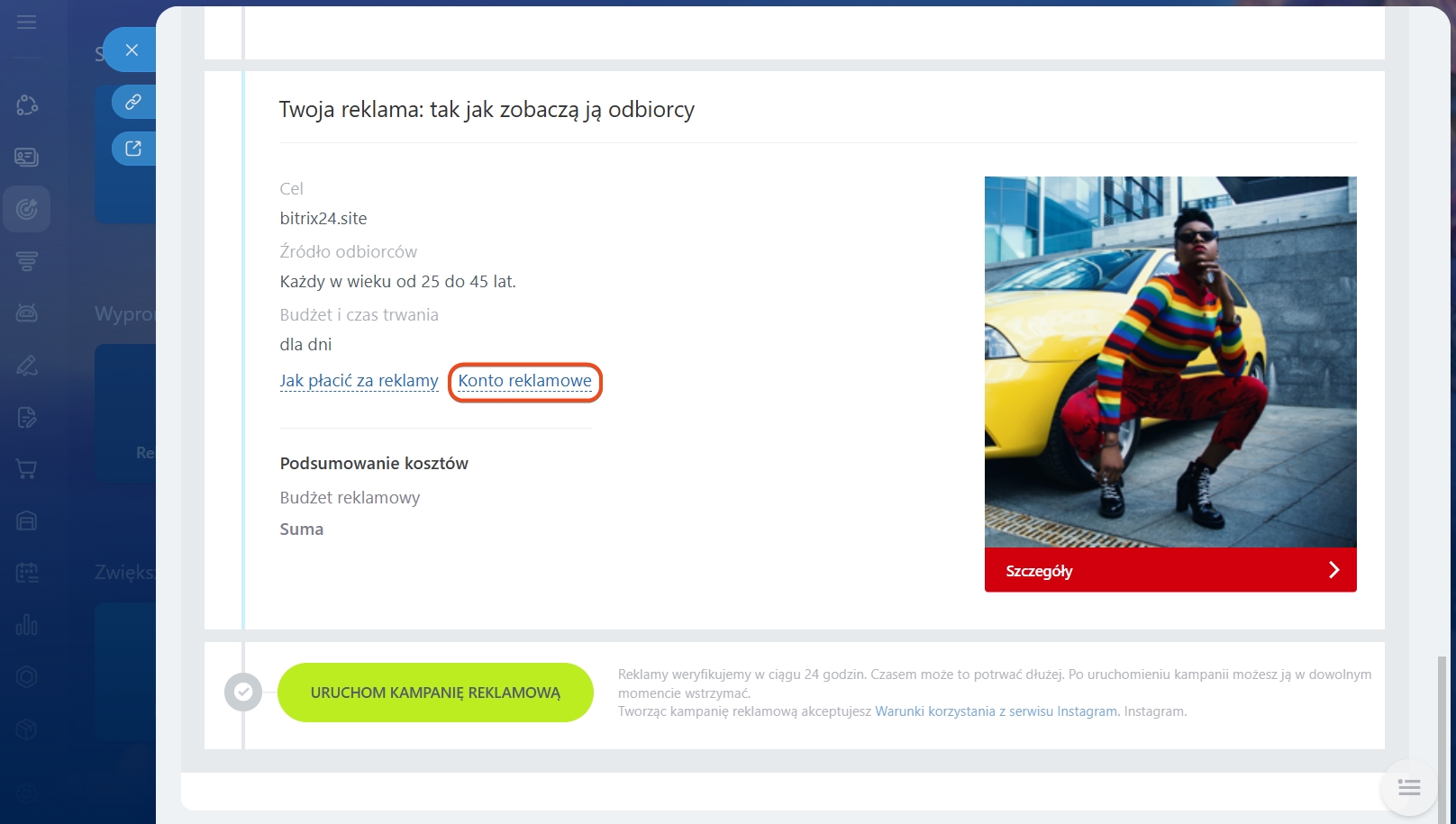 Przejdź do sekcji Twoja reklama: tak jak zobaczą ją odbiorcy i kliknij Konto reklamowe.
