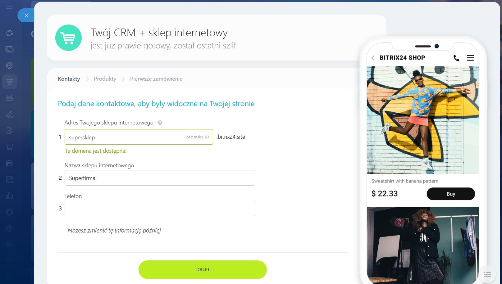 Możesz utworzyć własny sklep w zaledwie kilka minut przy pomocy kreatora Bitrix24. Nie musisz mieć doświadczenia w tworzeniu stron internetowych.