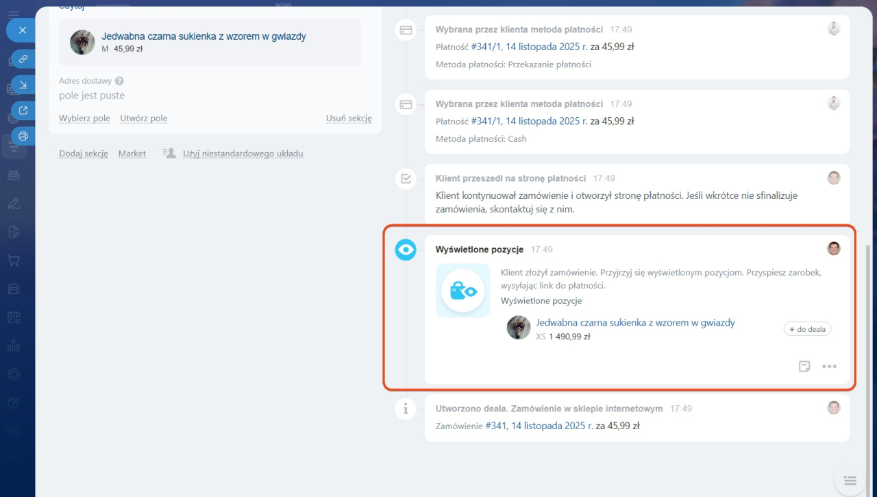 W formularzu deala zobaczysz, jakie produkty przeglądał klient. Informacje te pomogą zasugerować dodatkowe produkty, które mogą zainteresować klienta.