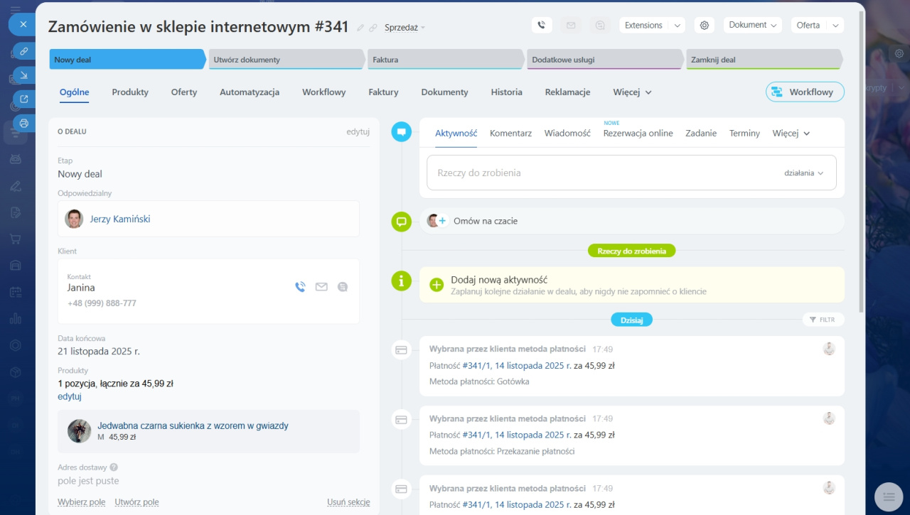Nowy sklep świetnie nadaje się do pracy bez zamówień. W tym scenariuszu akceptujesz płatność i komunikujesz się z klientem w formularzu deala.