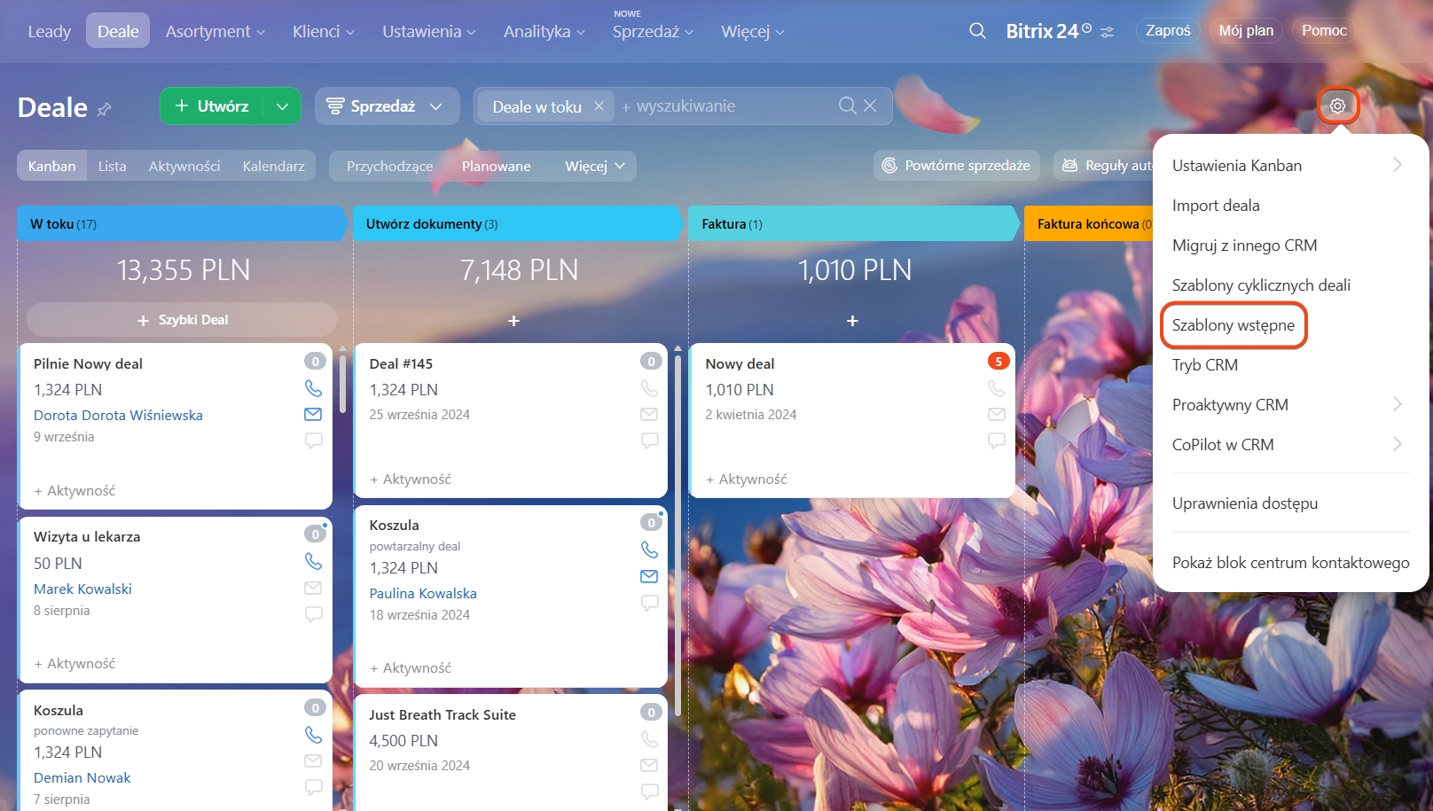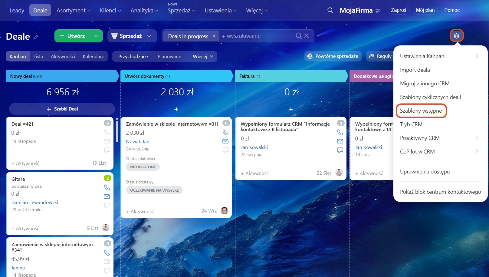 Otwórz sekcję CRM i wybierz Szablony wstępne.