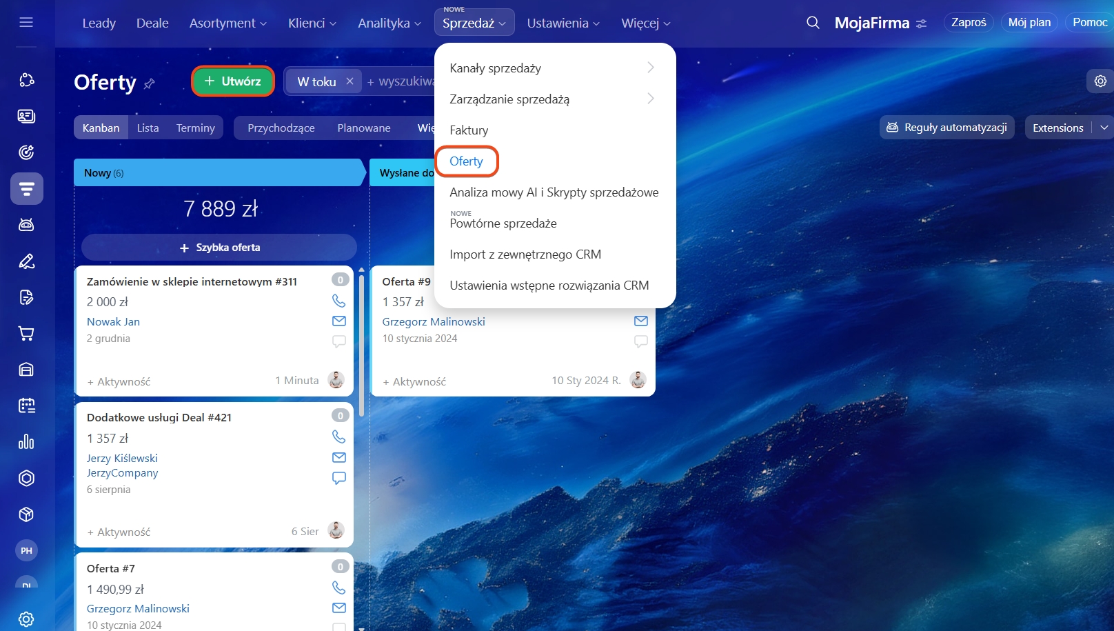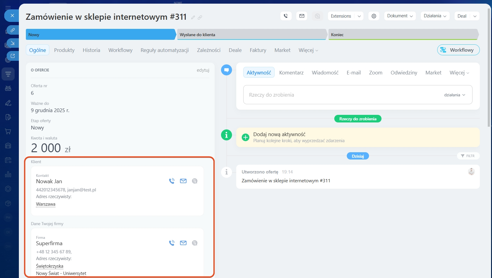 Możesz również utworzyć ofertę z odpowiedniej sekcji CRM lub z formularza firmy i kontaktu.