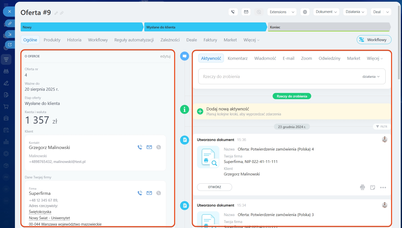 W górnej części formularza znajdują się przyciski Działania i Dokument. Za pomocą tych przycisków możesz utworzyć i wysłać klientowi ofertę handlową.