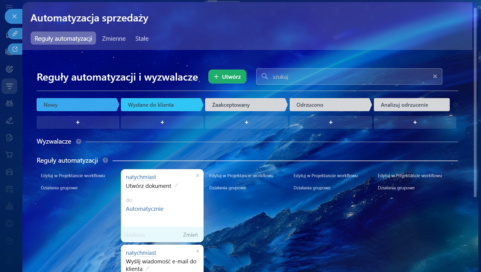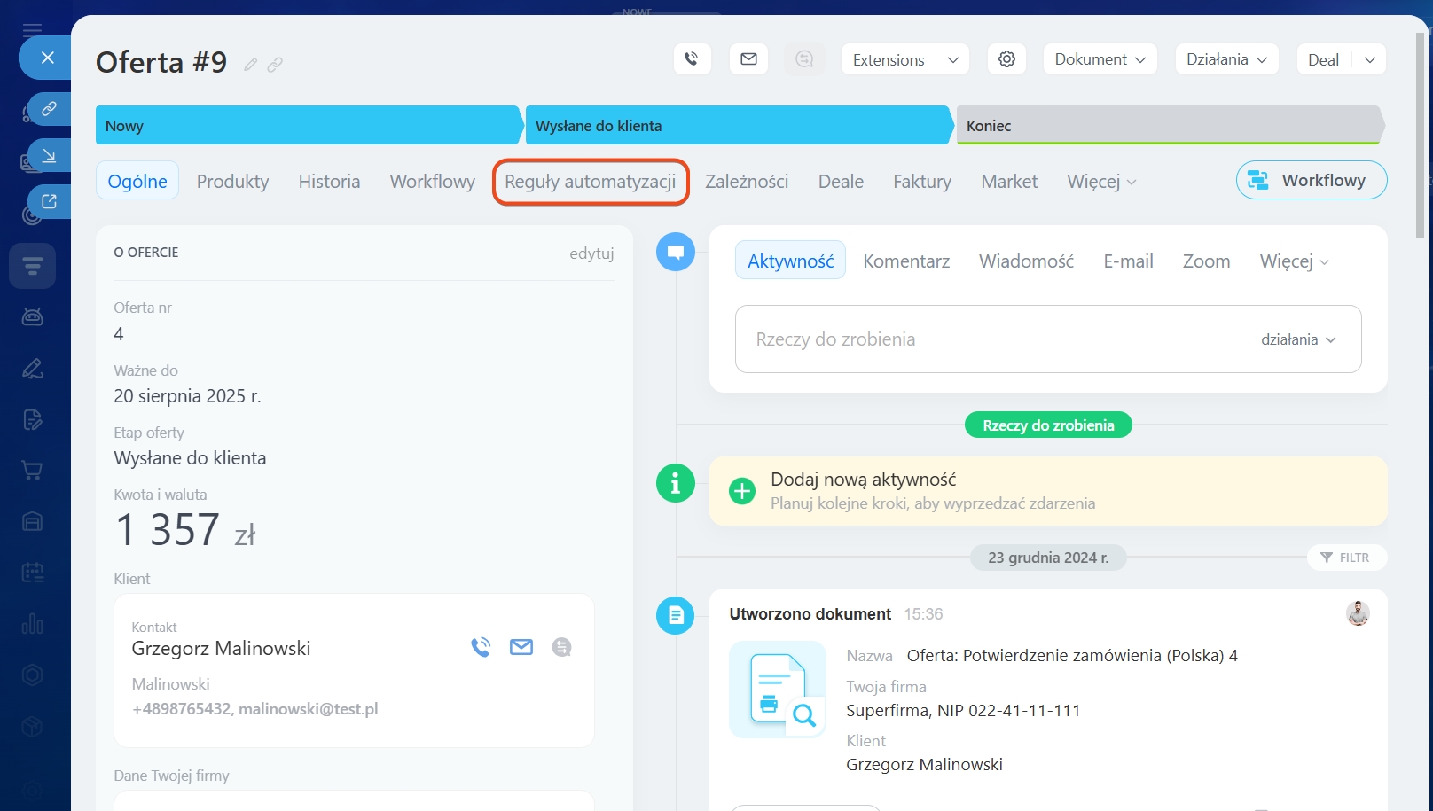Możesz zautomatyzować pracę z ofertami za pomocą wyzwalaczy, reguł automatyzacji i workflow. Reguły automatyzacji mogą: