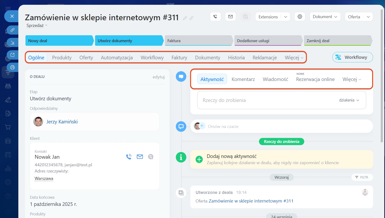 Otwórz formularz elementu CRM. Możesz dostosować pozycje menu głównego i pozycje osi czasu.