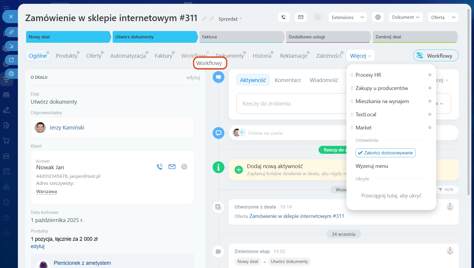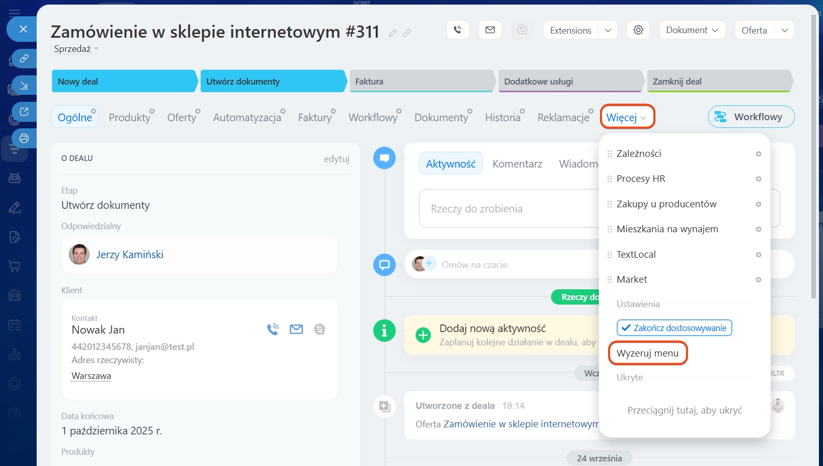 W formularzu CRM możesz dostosować pozycje menu. Jeśli nie korzystasz z workflow, reguł automatyzacji, aplikacji lub Zoom, możesz usunąć te pozycje z menu.