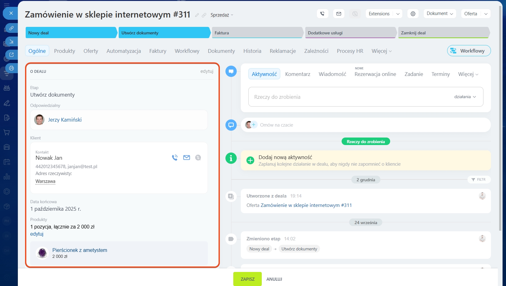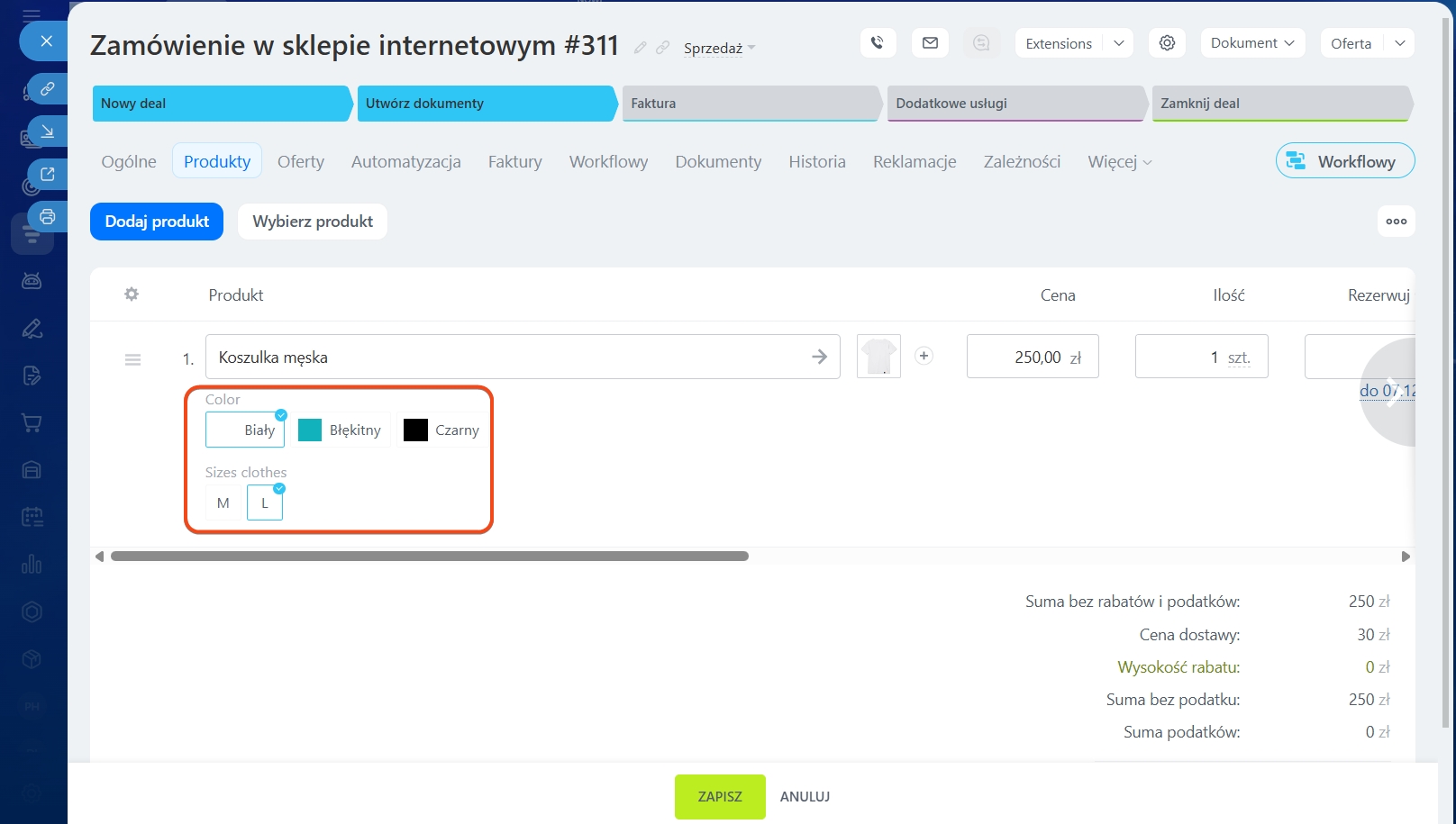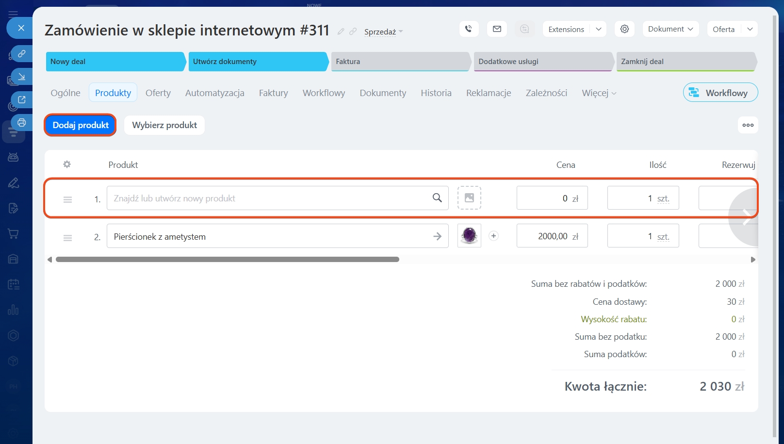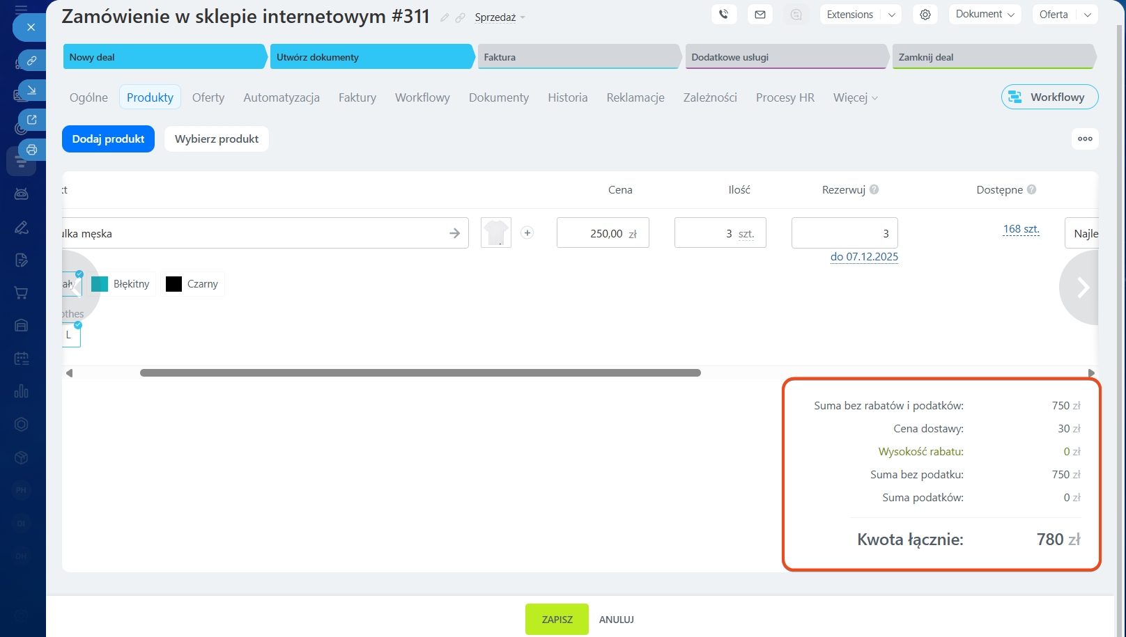 Zapisz zmiany po dodaniu produktów. Produkt zostanie wyświetlony w odpowiedniej sekcji w formularzu. Kwota produktów zostanie dodana do kwoty deala.