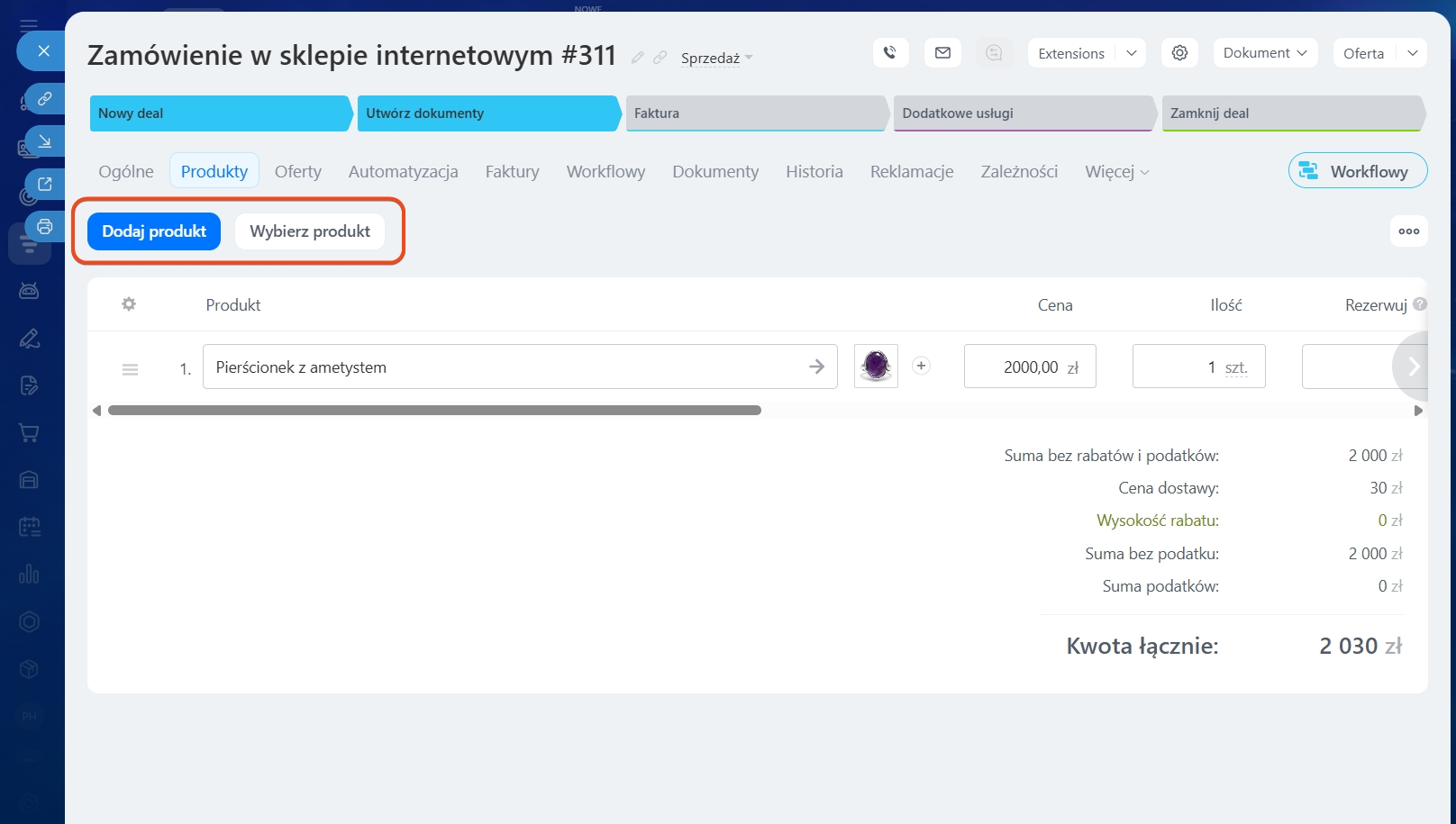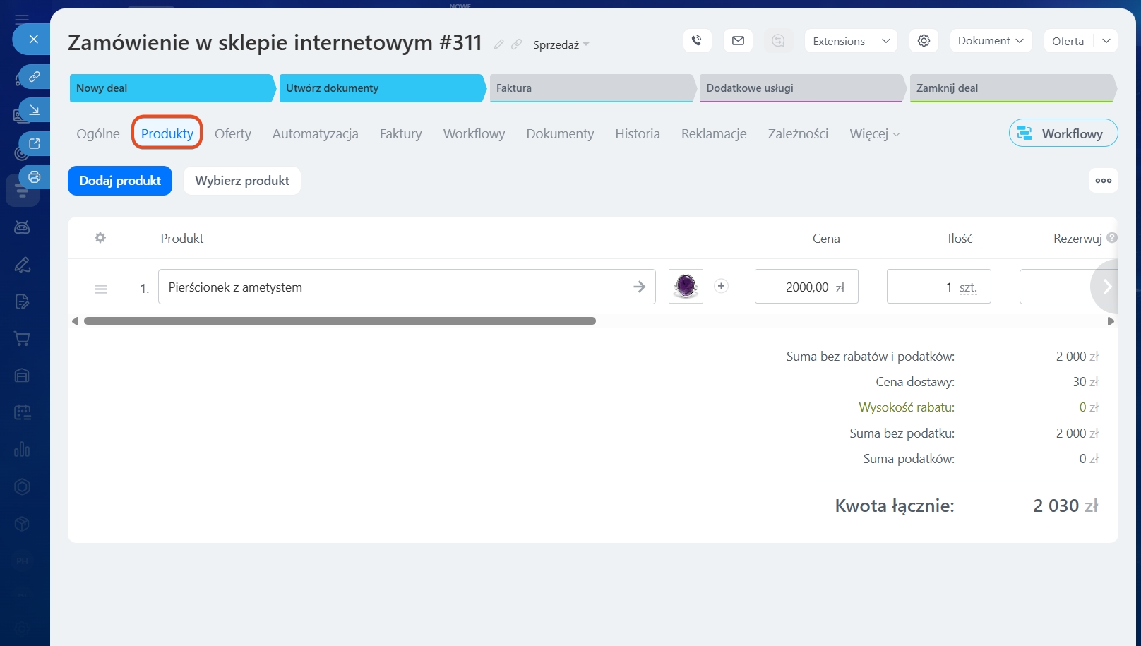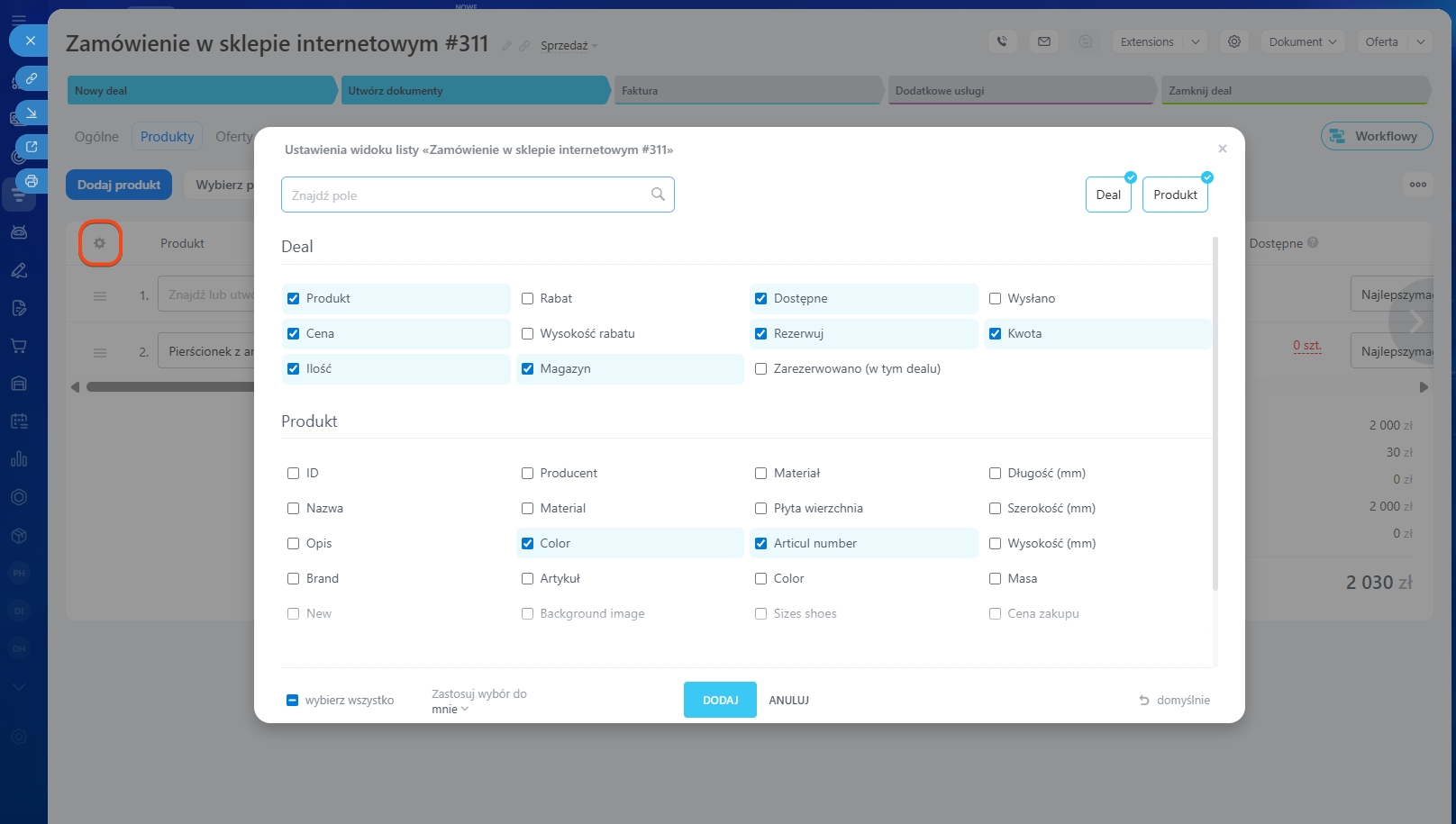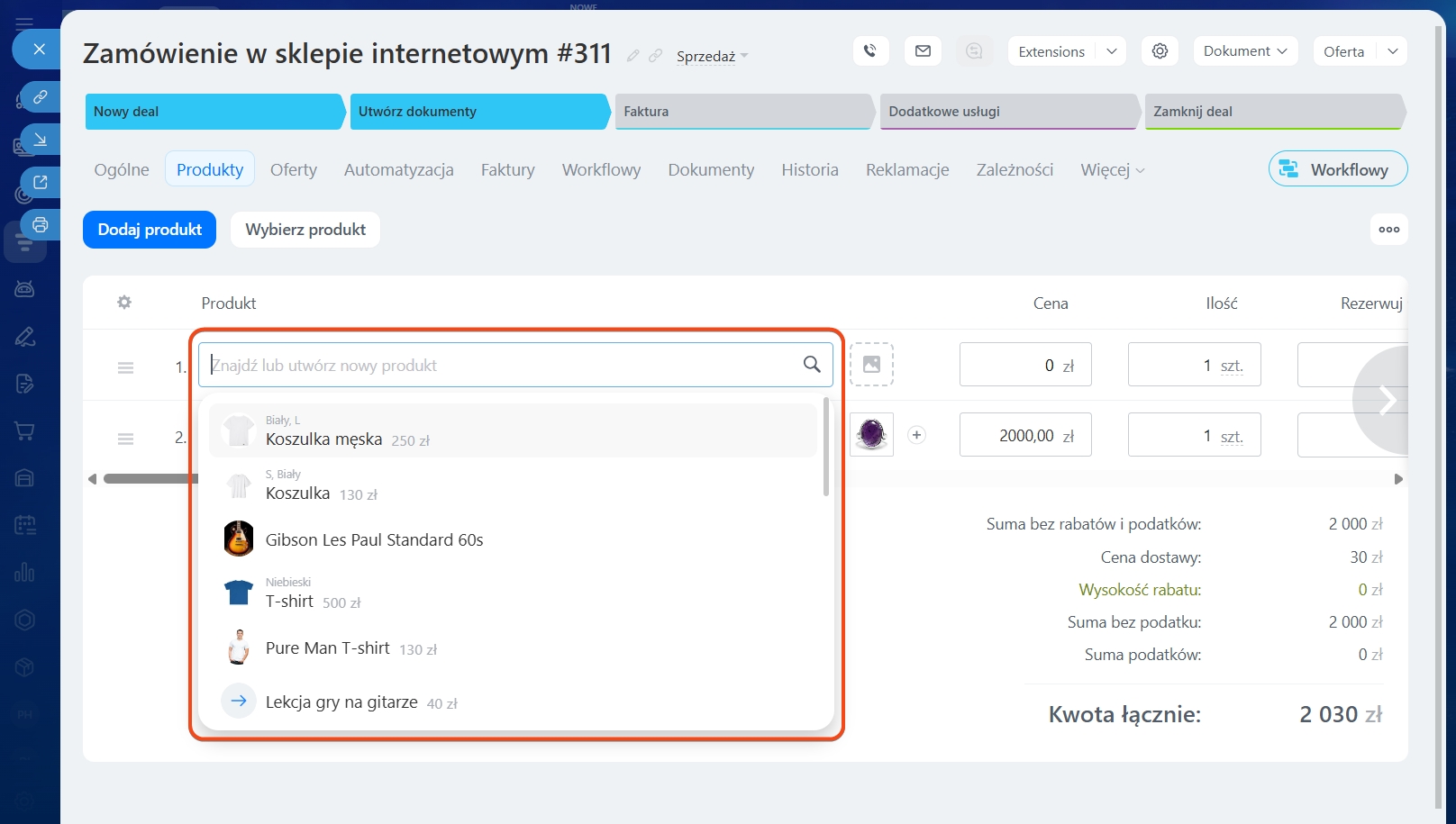Możesz dodawać produkty do formularzy leadów, deali, ofert i faktur.