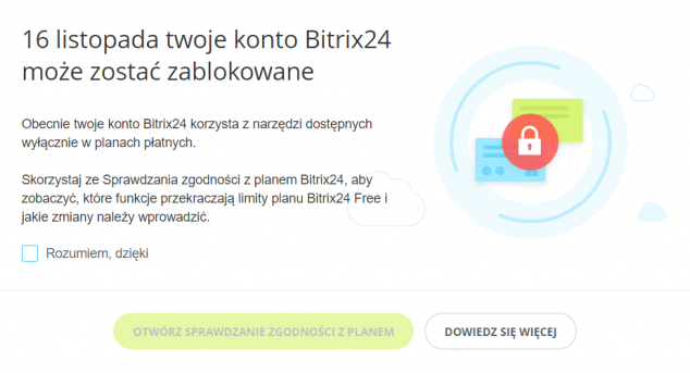 Jeśli nie wyłączysz funkcji niezgodnych z Twoim planem w ciągu 15 dni, korzystanie z Bitrix24 zostanie zawieszone. Nie będziesz mógł pracować w Bitrix24, dopóki nie dokonasz zmian zgodnie ze swoim planem lub nie przełączysz się na odpowiedni plan.