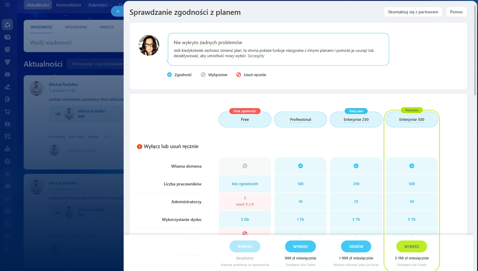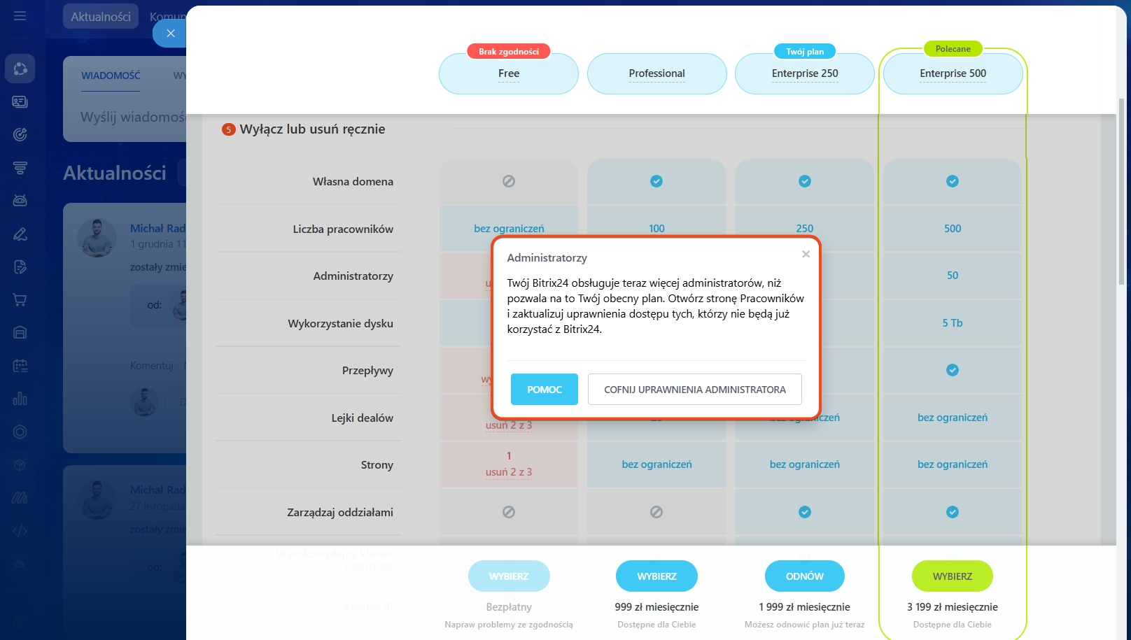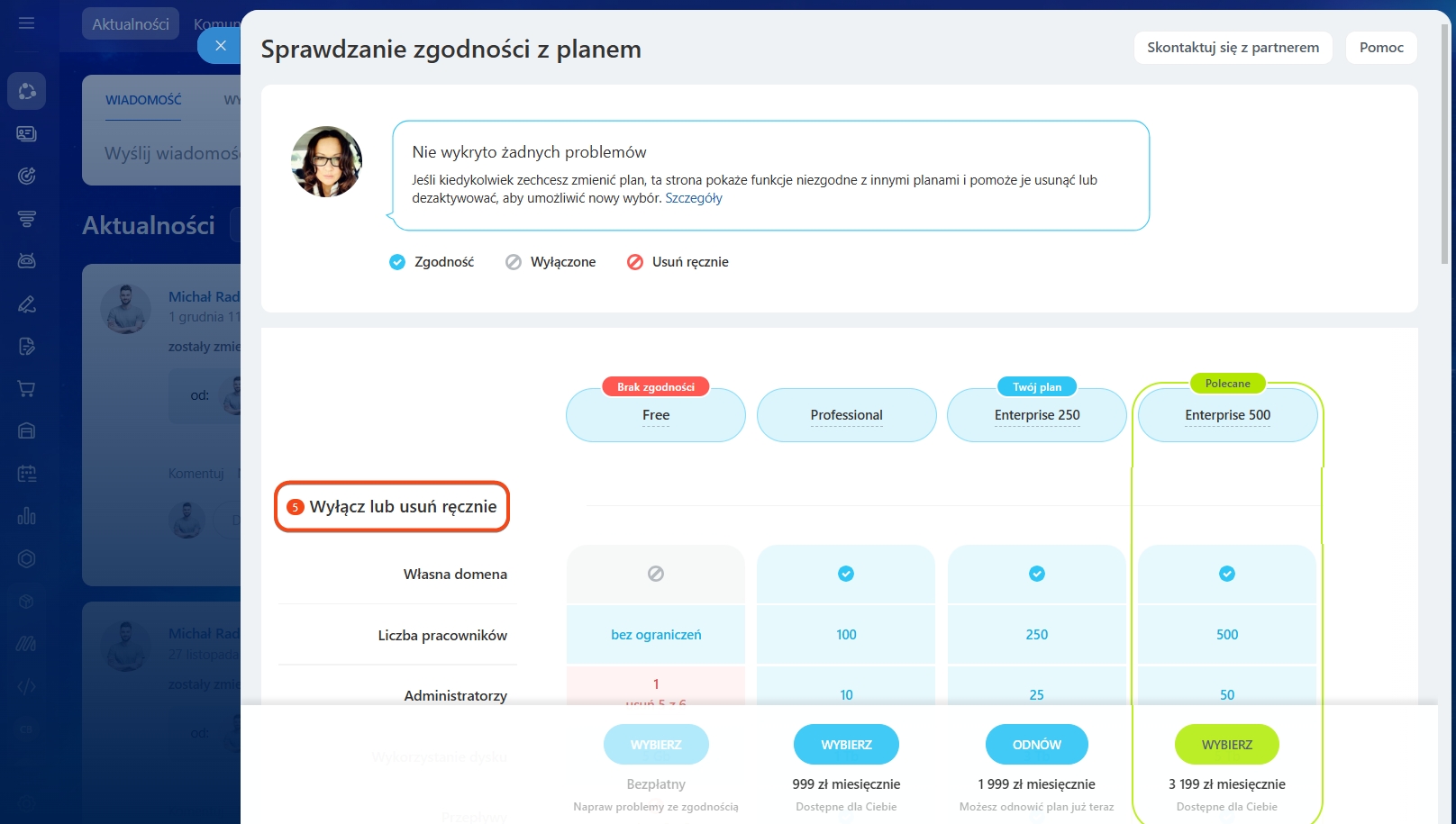 Jeśli masz funkcje, które nie pasują do Twojego obecnego planu Bitrix24, Sprawdzanie zgodności z planem pokaże Ci, co musisz zmienić.
