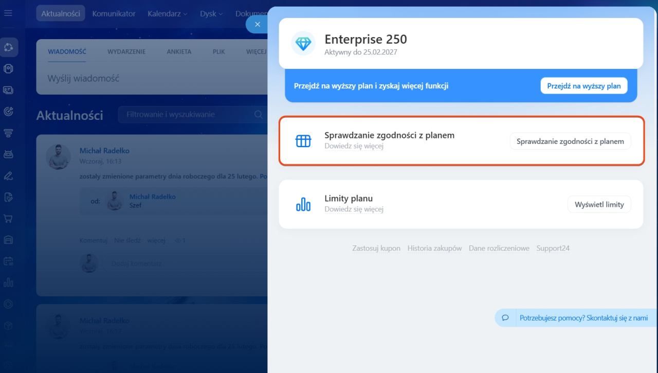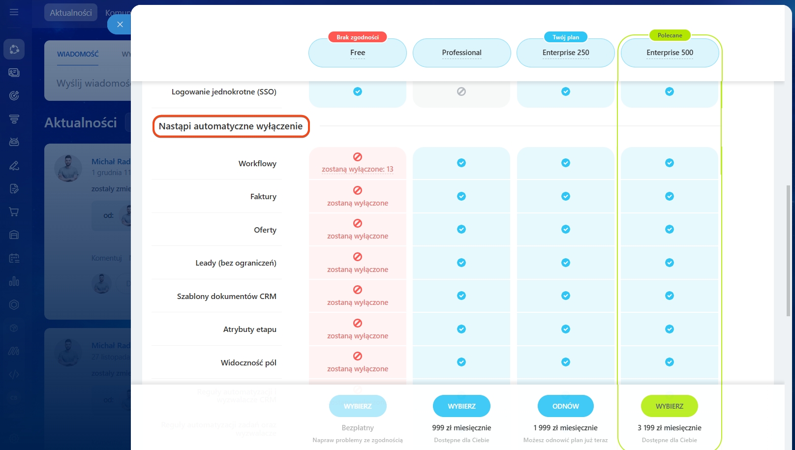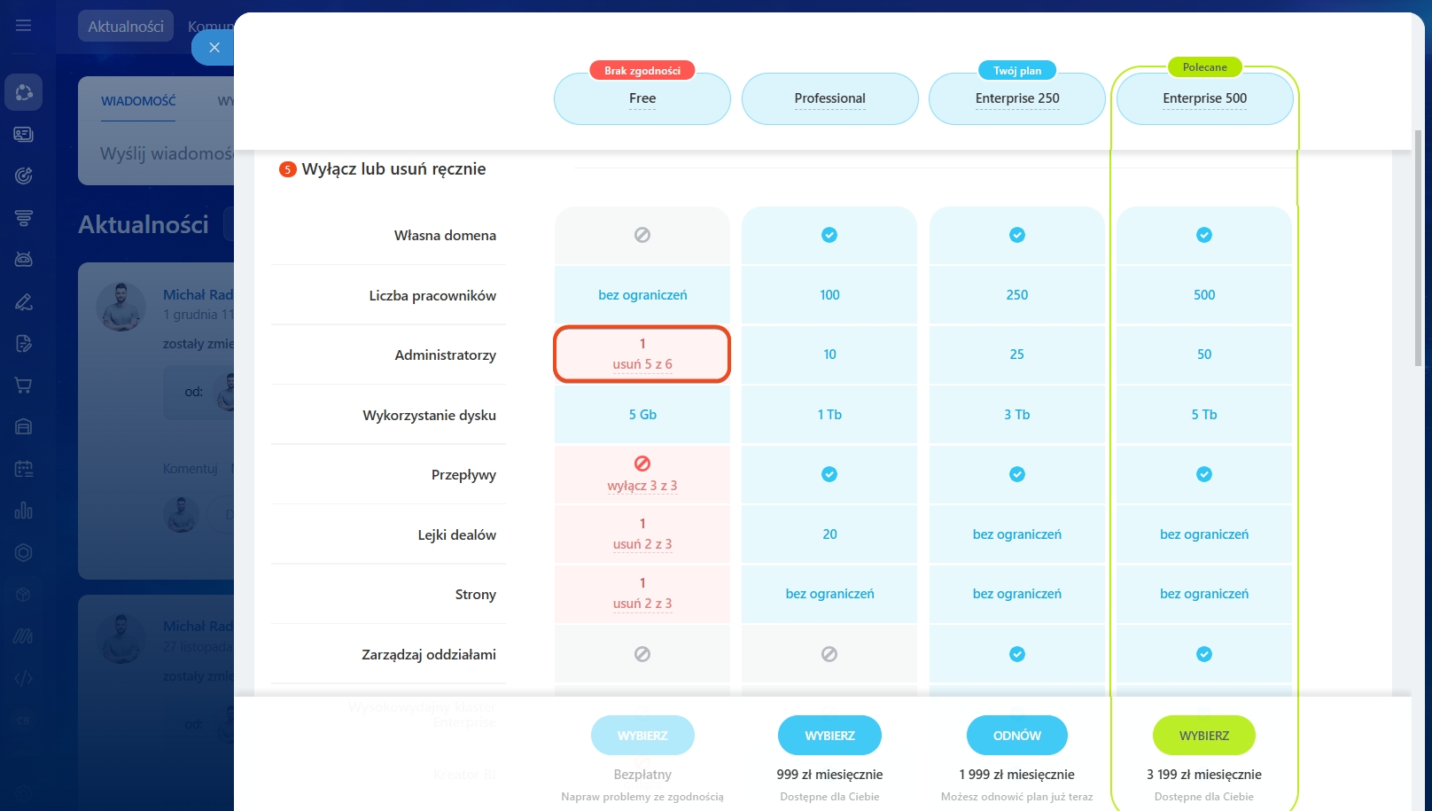 Jeśli masz funkcje, które nie pasują do Twojego obecnego planu Bitrix24, Sprawdzanie zgodności z planem pokaże Ci, co musisz zmienić.