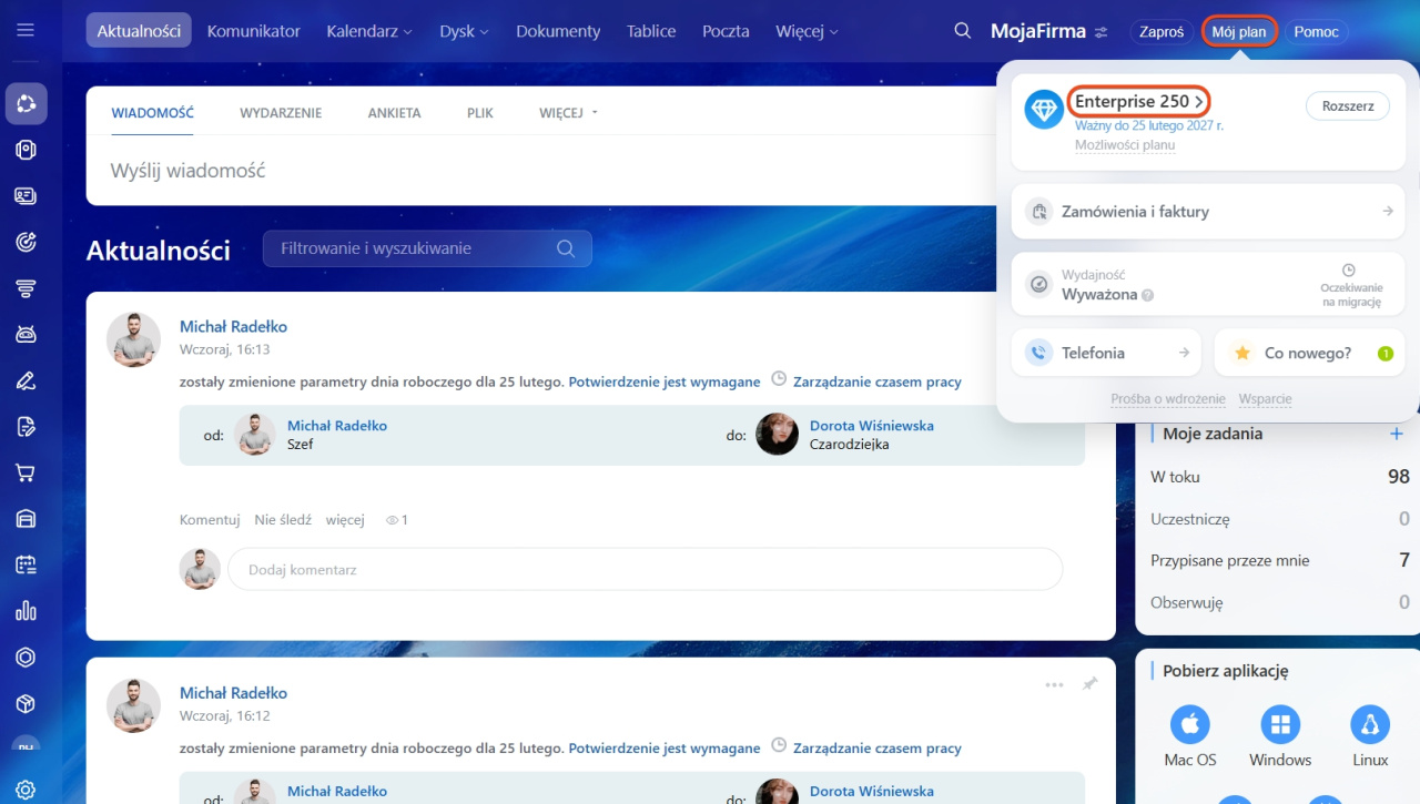 - Wysokowydajny klaster Enterprise - po przejściu na plan Enterprise Twój Bitrix24 jest na żądanie przenoszony do specjalnej infrastruktury. Aby zmienić plan, musisz najpierw skontaktować się z pomocą techniczną w celu przeniesienia Bitrix24 na zwykły serwer.