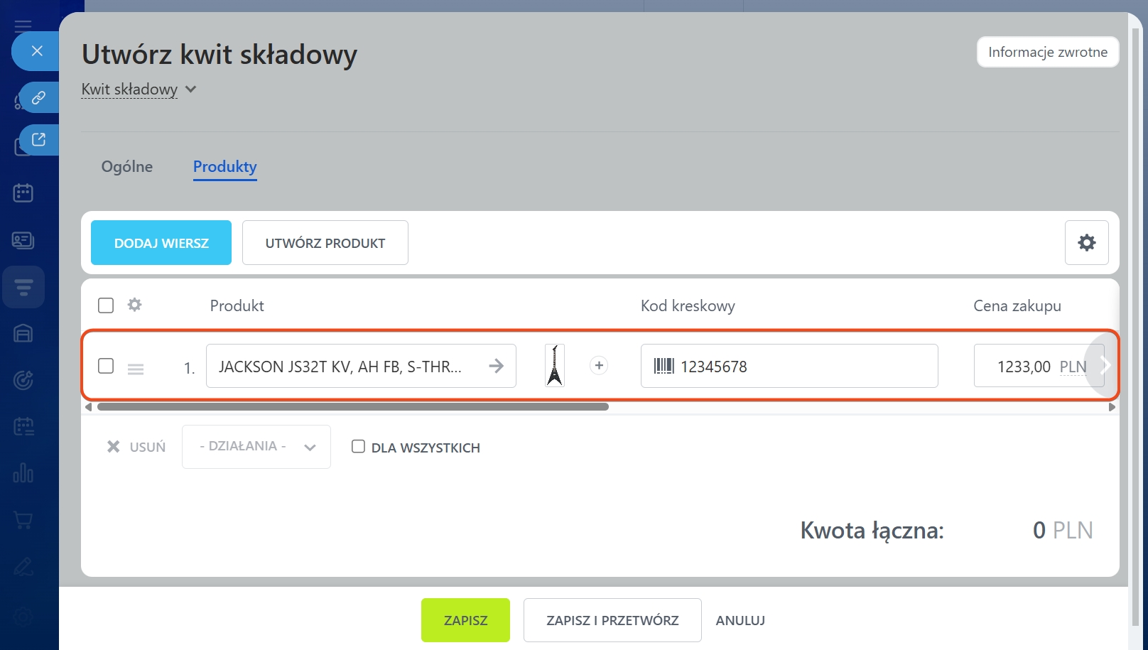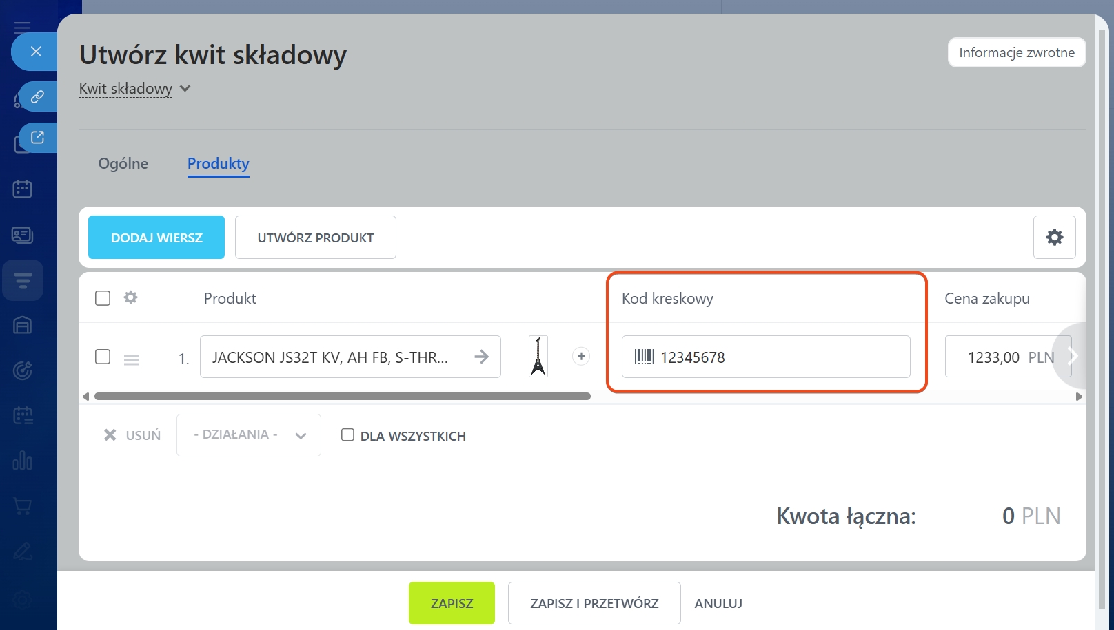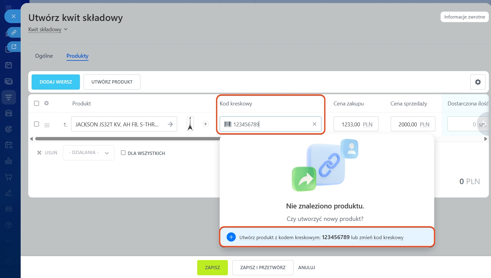Aby dodać lub znaleźć potrzebny produkt według kodu kreskowego, kliknij ikonę kodu kreskowego.