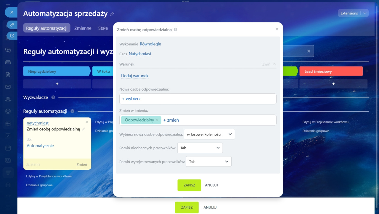 - Tak - pracownicy, którzy nie mają wskazanej nieobecności, nie będą otrzymywać leadów i deali. Reguła wybierze kolejnego lub losowego pracownika z kolejki, w zależności od wartości w opcji Wybierz nową osobę odpowiedzialną.