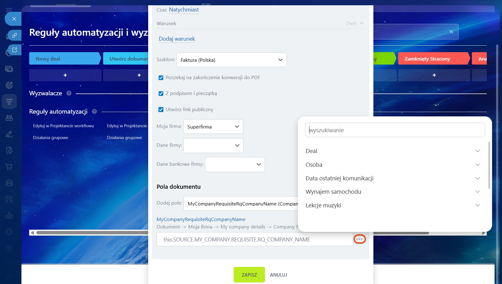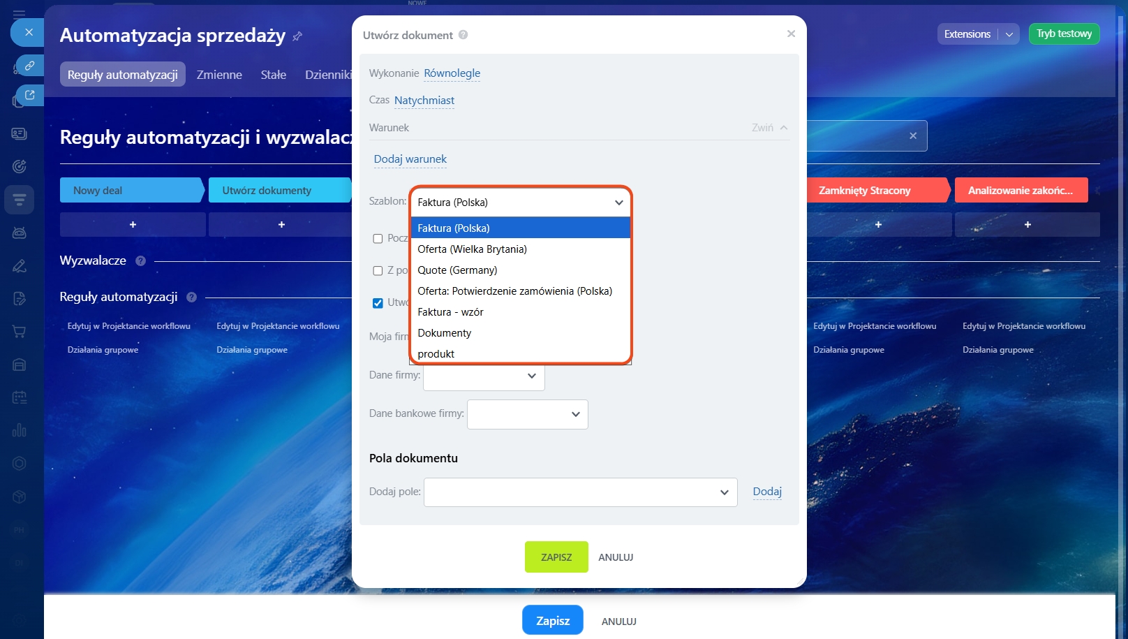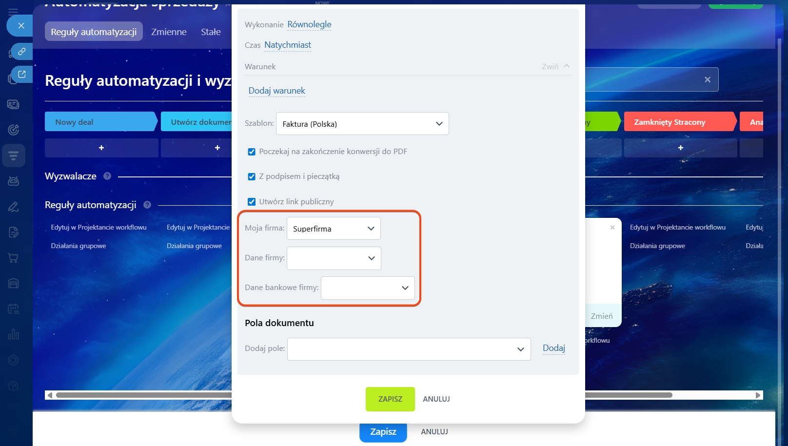 Reguła automatyzacji Utwórz dokument CRM ma kilka opcji, które wpływają na ostateczny dokument. Przyjrzyjmy się im bliżej.