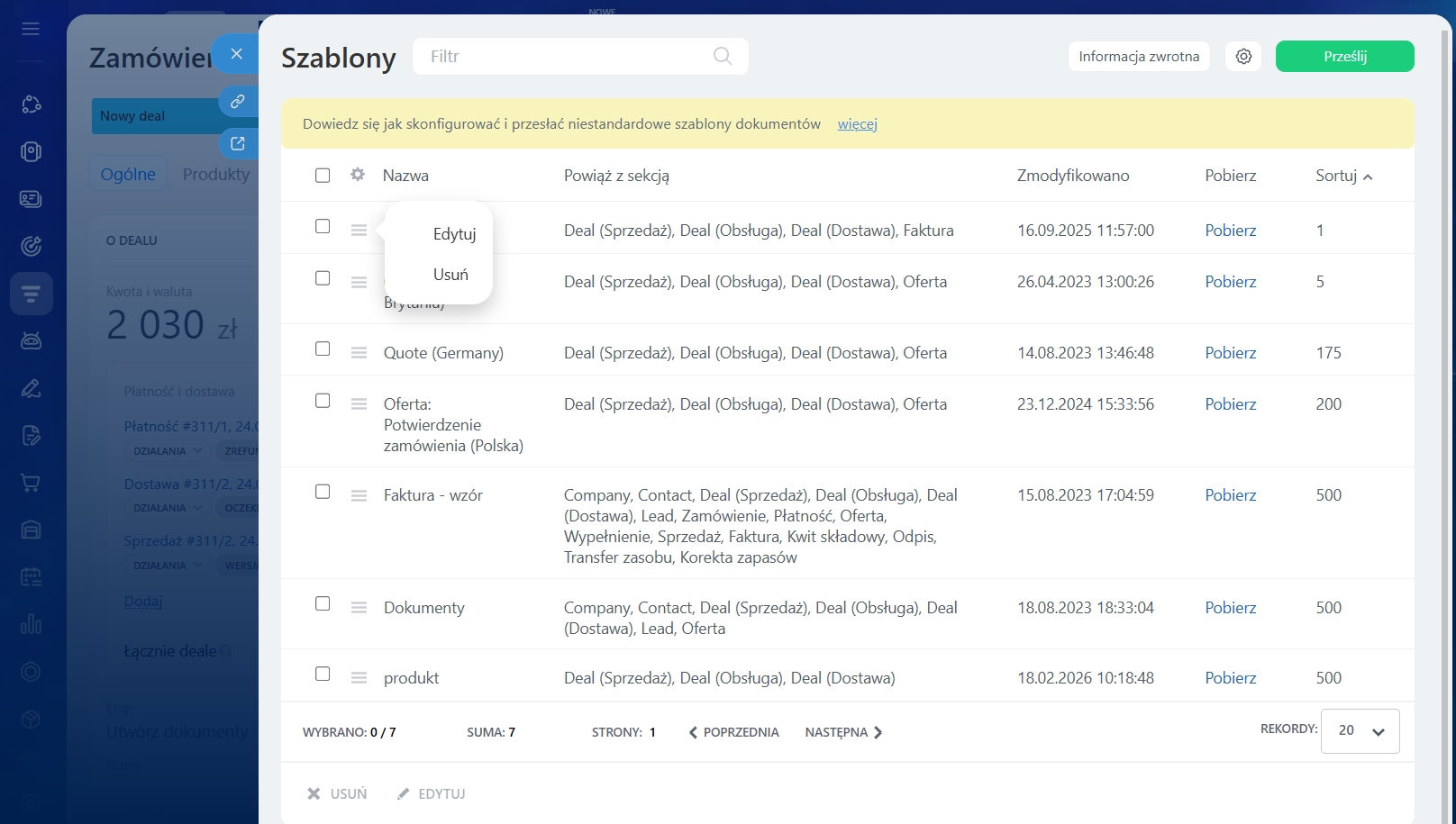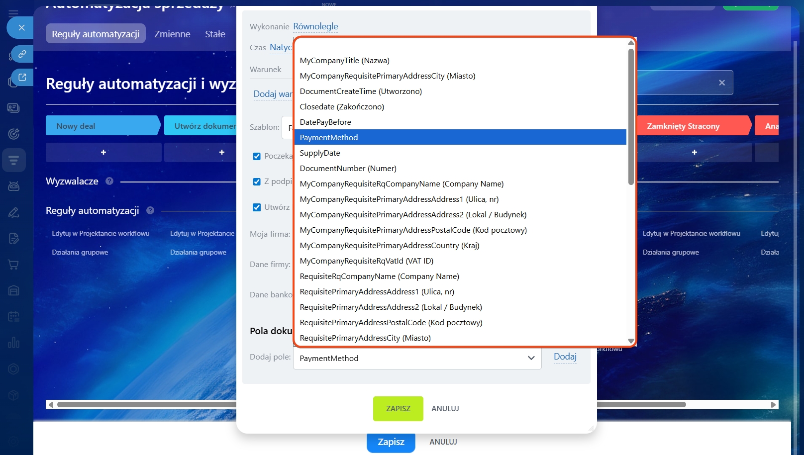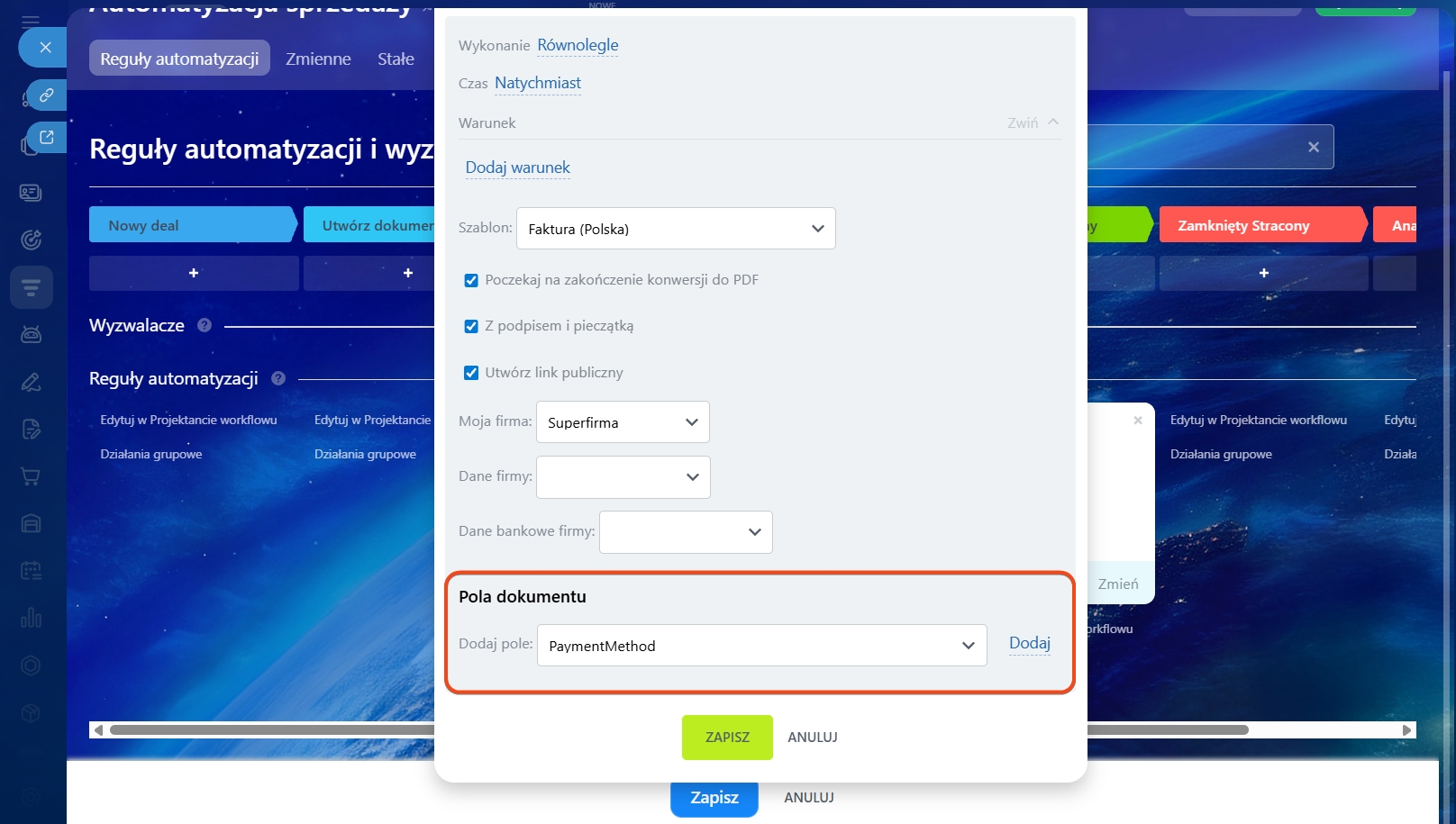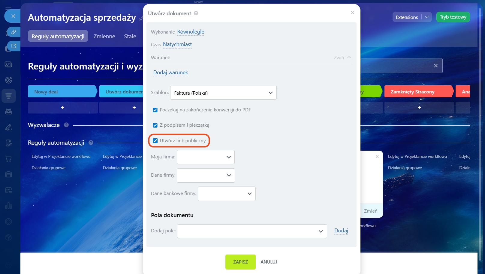 Reguła automatyzacji Utwórz dokument CRM ma kilka opcji, które wpływają na ostateczny dokument. Przyjrzyjmy się im bliżej.