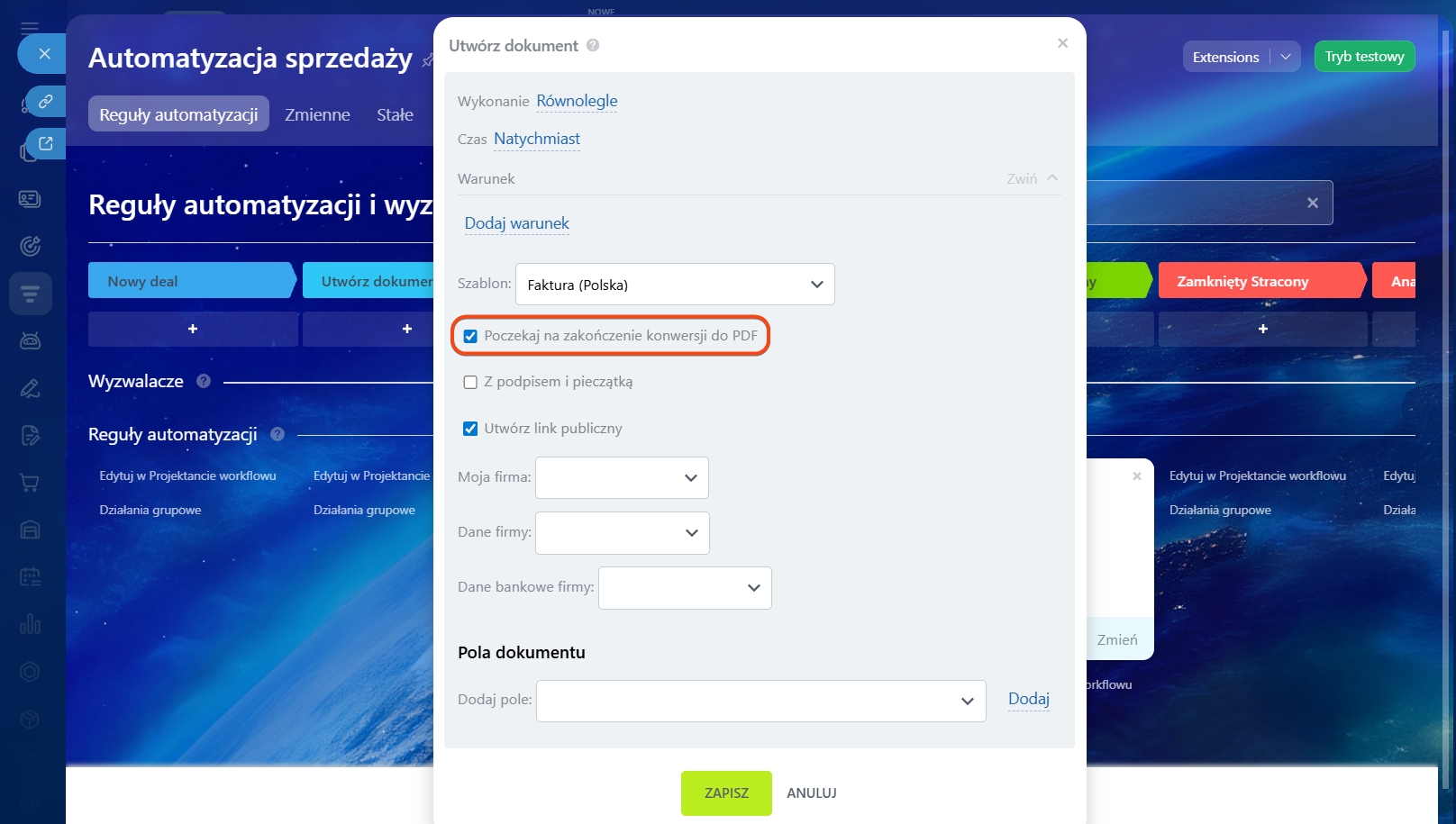 - Poczekaj na zakończenie konwersji do PDF. Ta opcja pozwala wysyłać link do dokumentu PDF w innych regułach. Na przykład w regule Wyślij e-mail do klienta. Uruchomienie workflow lub kolejnej reguły zatrzymuje się na czas generowania dokumentu, zwykle na kilka sekund.