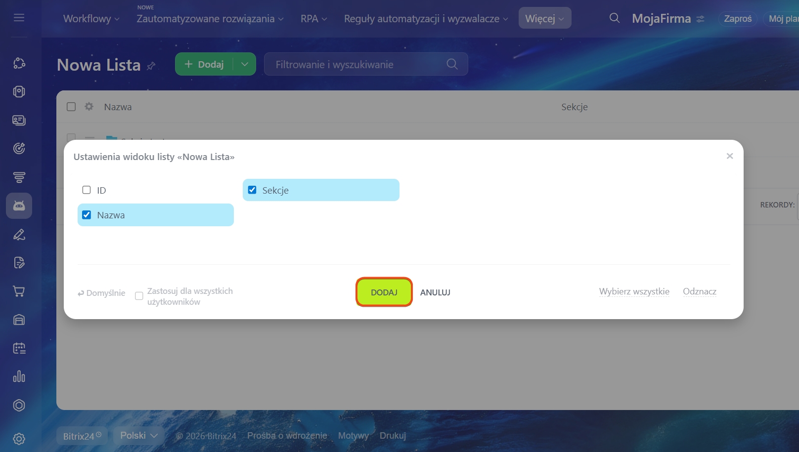 Zaznacz pola, które chcesz wyświetlić i kliknij Dodaj.