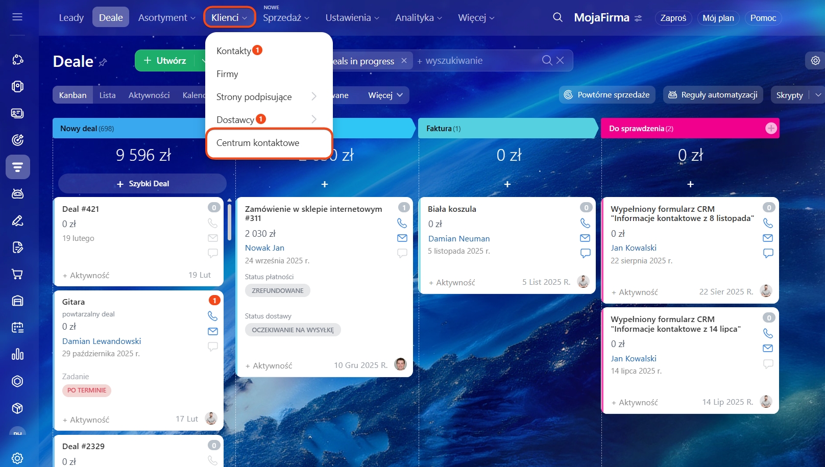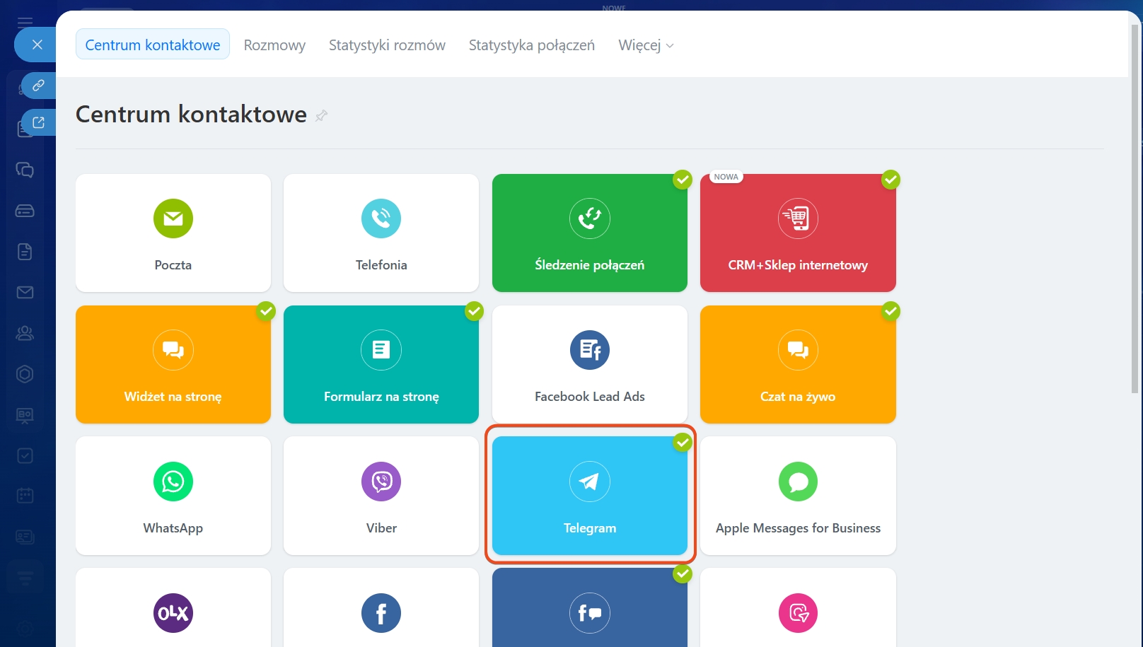 Najpierw musisz podłączyć lub skonfigurować istniejący kanał Telegram. Aby to zrobić, przejdź do CRM> Klienci> Centrum Kontaktowe.