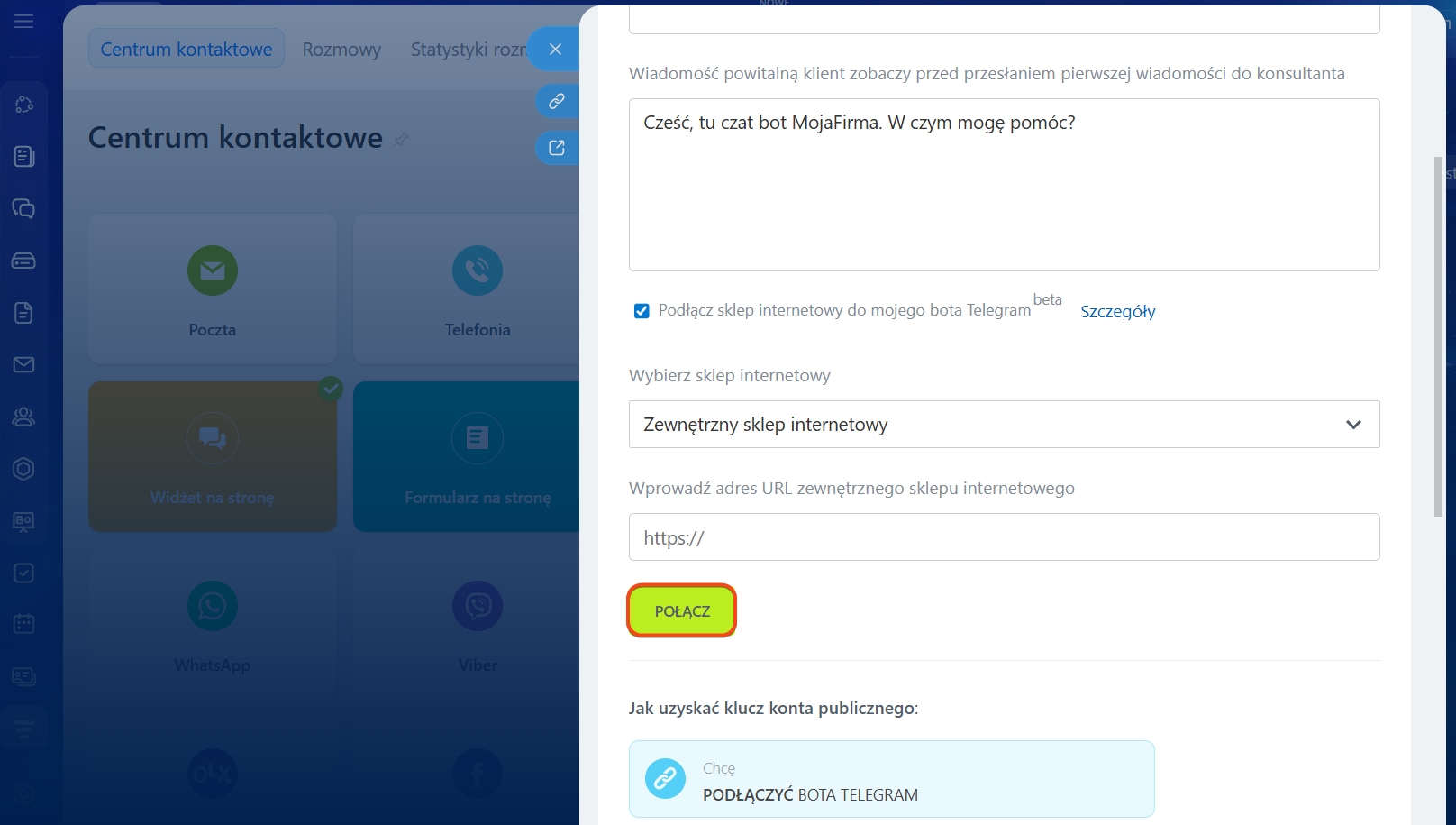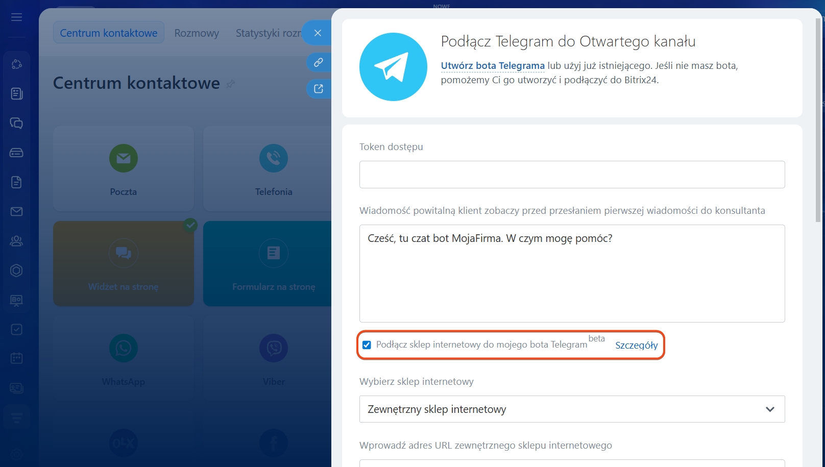 W ustawieniach kanału zaznacz opcję Połącz sklep internetowy z botem Telegram.