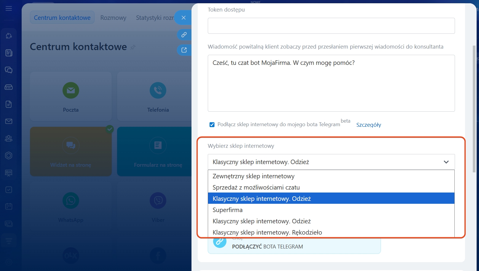 Następnie wybierz sklep internetowy, który chcesz połączyć z botem.
