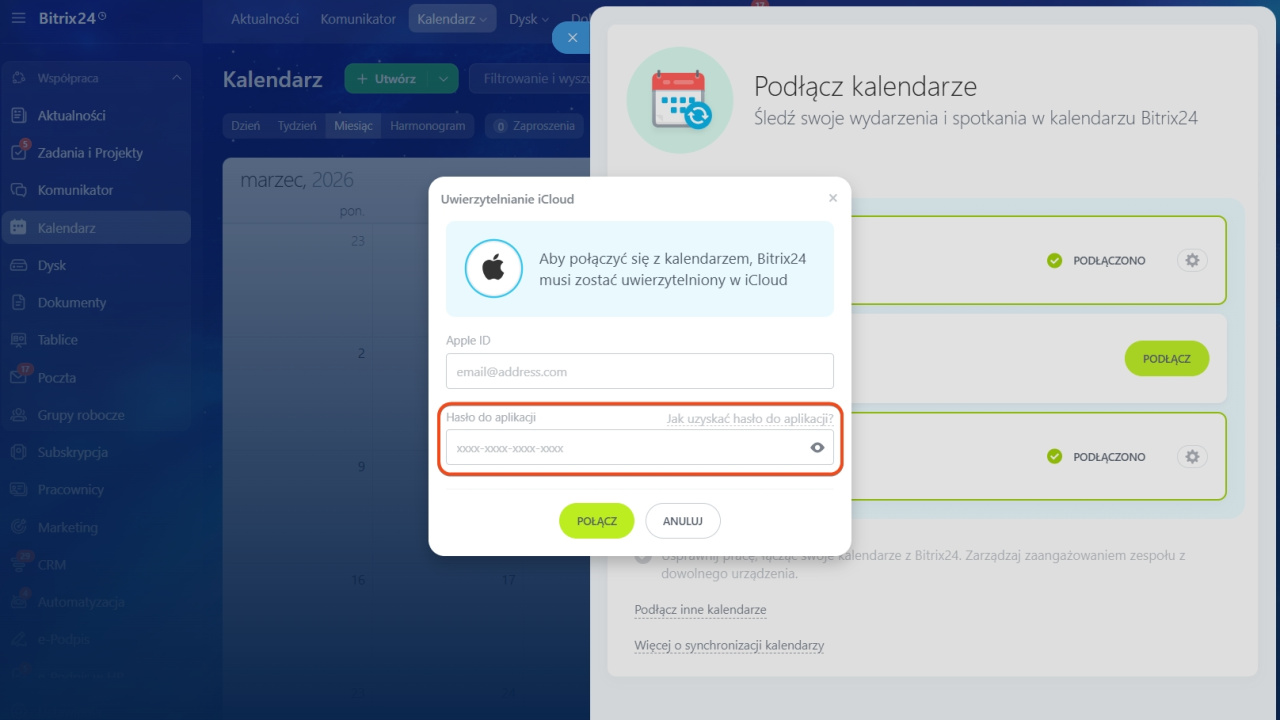 Wprowadź je w polu Hasło aplikacji podczas synchronizacji z Bitrix24.