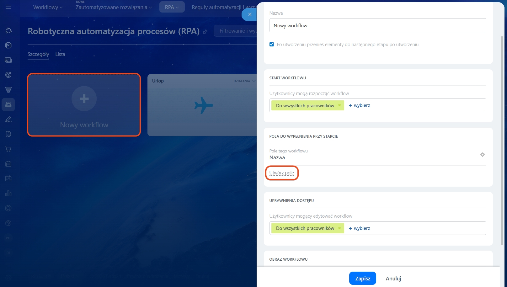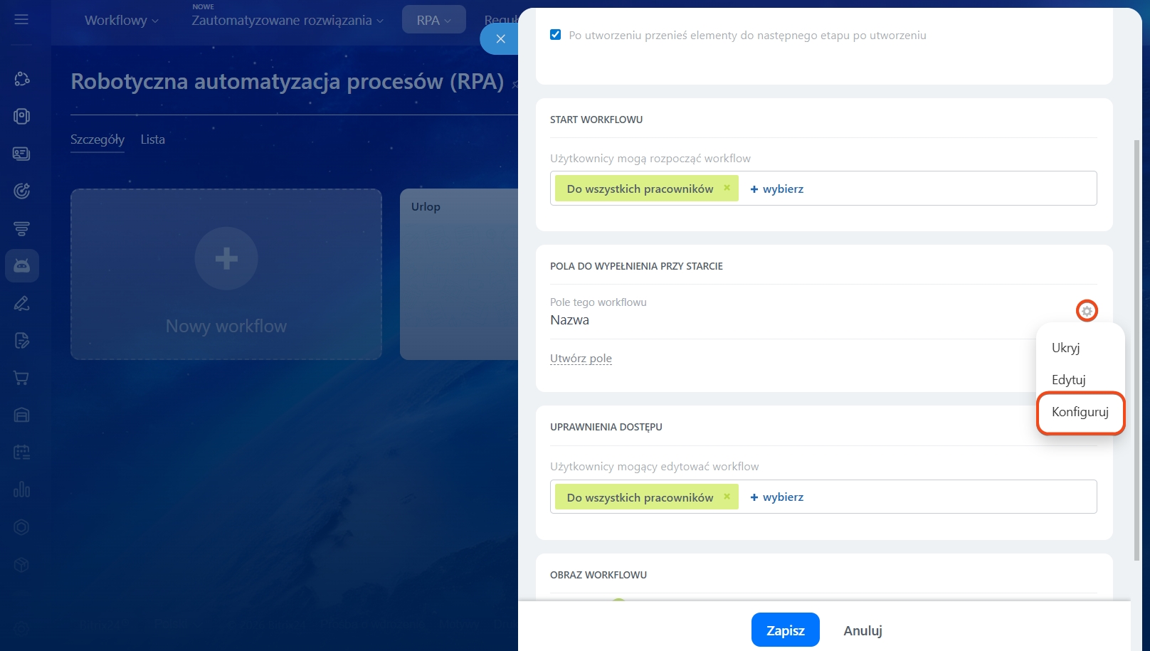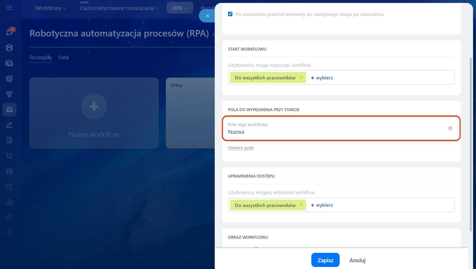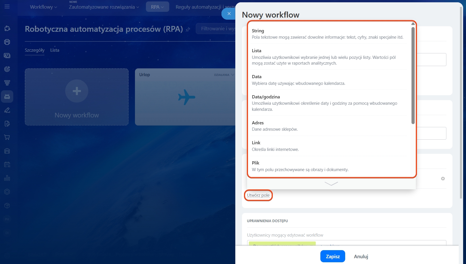 W suwaku zobaczysz listę pól, które zostały już dodane do procesu. Jeśli chcesz utworzyć nowe pole, kliknij odpowiedni przycisk.