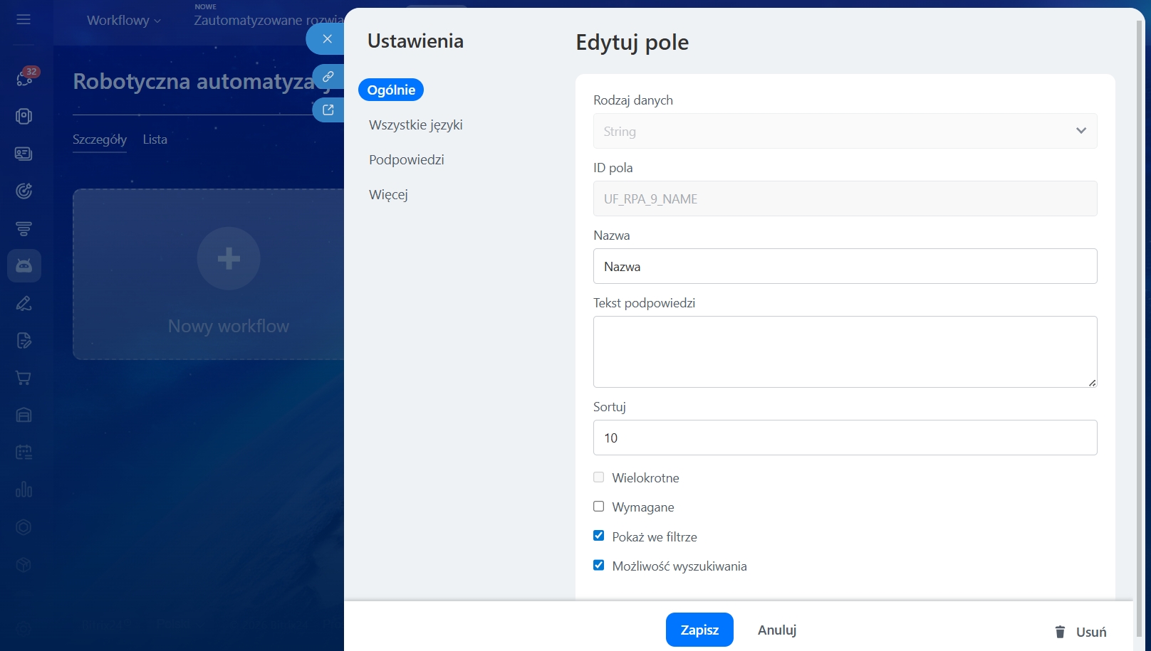 Skonfiguruj ustawienia pola i zapisz zmiany. Następnie możesz użyć pola w tym procesie.