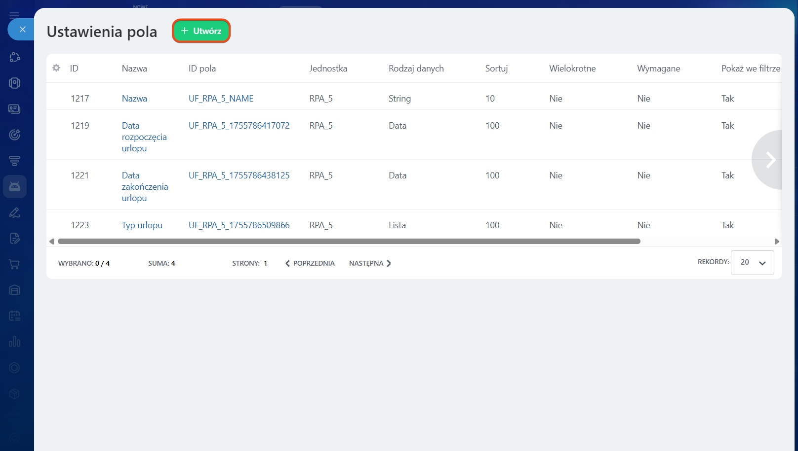 W RPA, w przeciwieństwie do elementów CRM, nie ma wstępnie ustawionych pól. Oznacza to, że musisz sam utworzyć pola, których będziesz używać w swojej pracy.