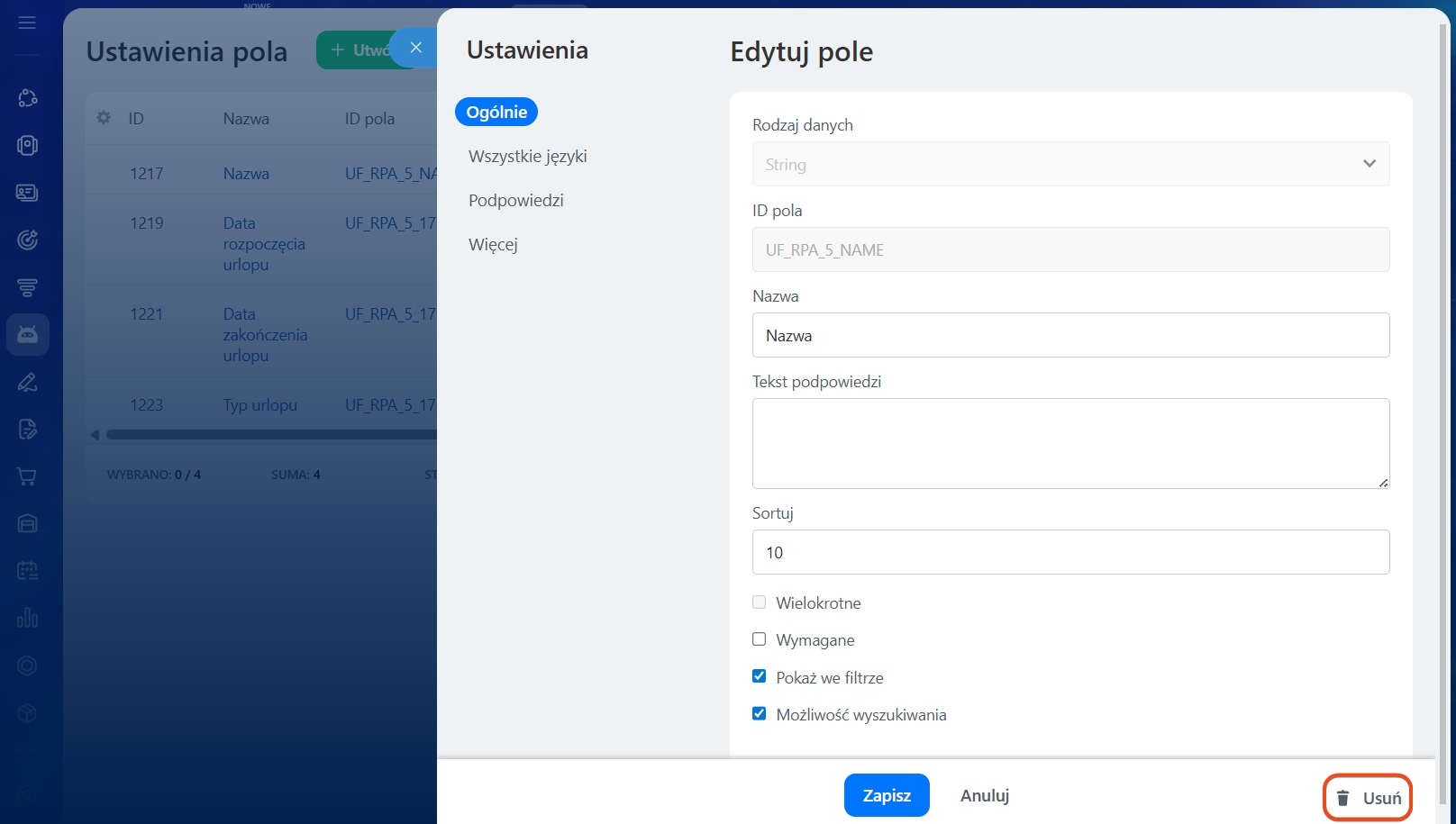 Aby edytować pole, kliknij jego nazwę, a otworzy się suwak z ustawieniami. Możesz także usunąć pole, klikając odpowiedni przycisk.