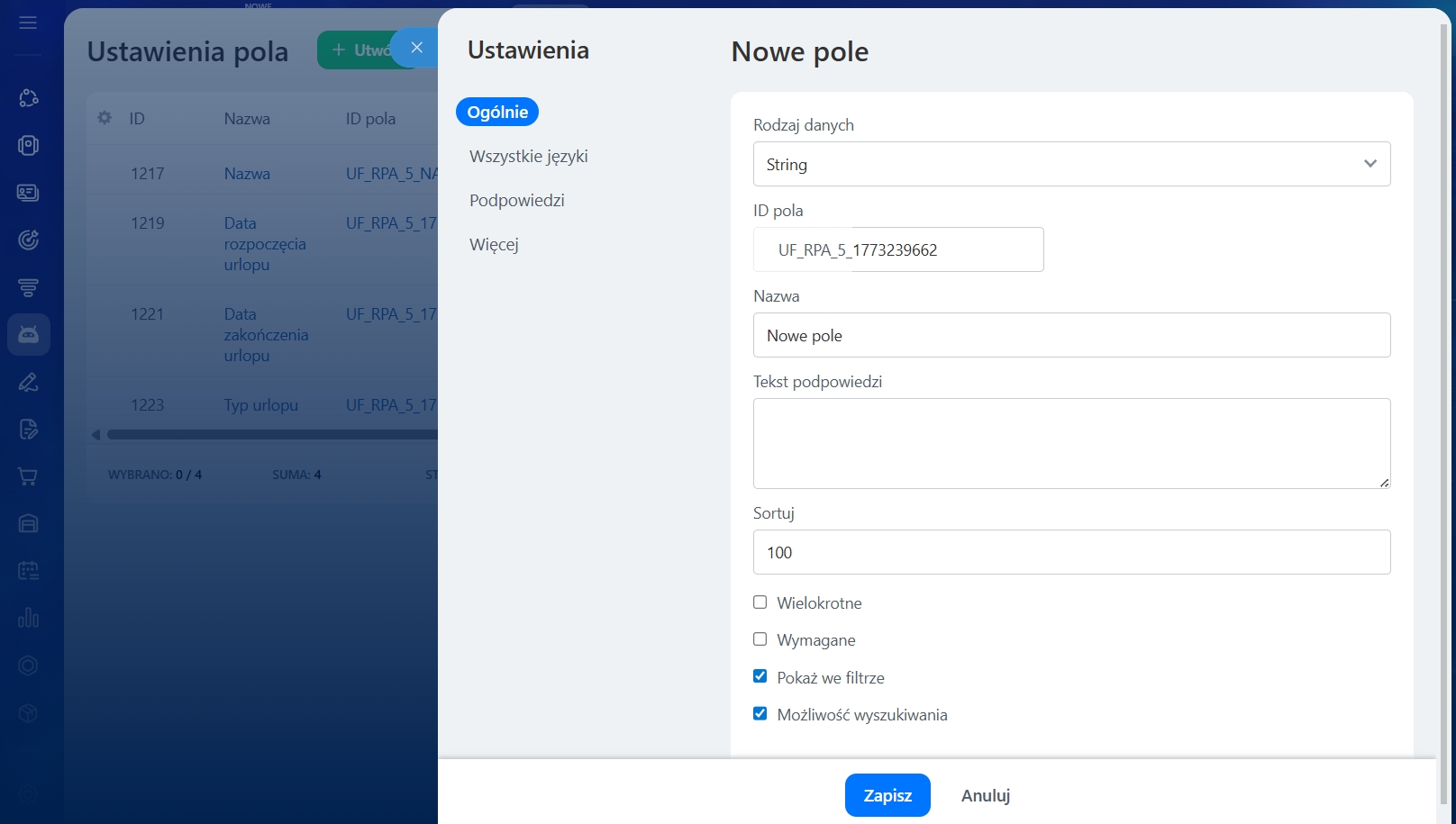 - Sortuj - miejsce pola na liście zależy od sortowania. Im mniejsza liczba, tym bliżej początku listy znajduje się pole.