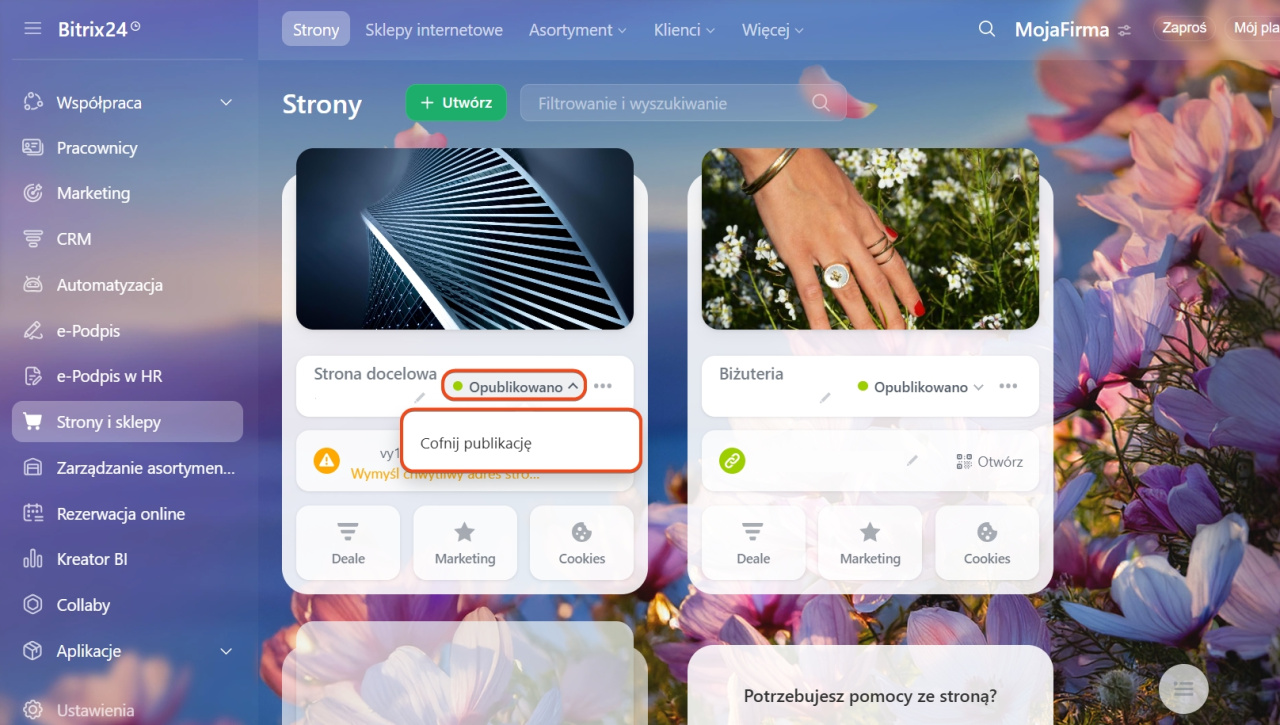 - Otwórz stronę (Open page) - możesz wybrać dowolną stronę z witryn utworzonych na Twoim koncie.