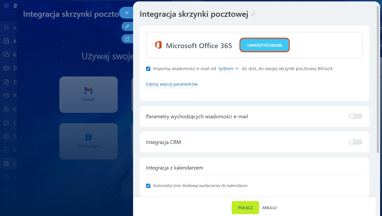 Teraz wystarczy kliknąć przycisk Uwierzytelnienie, aby zintegrować swoją skrzynkę pocztową Microsoft Office365 i Exchange Online z Bitrix24.