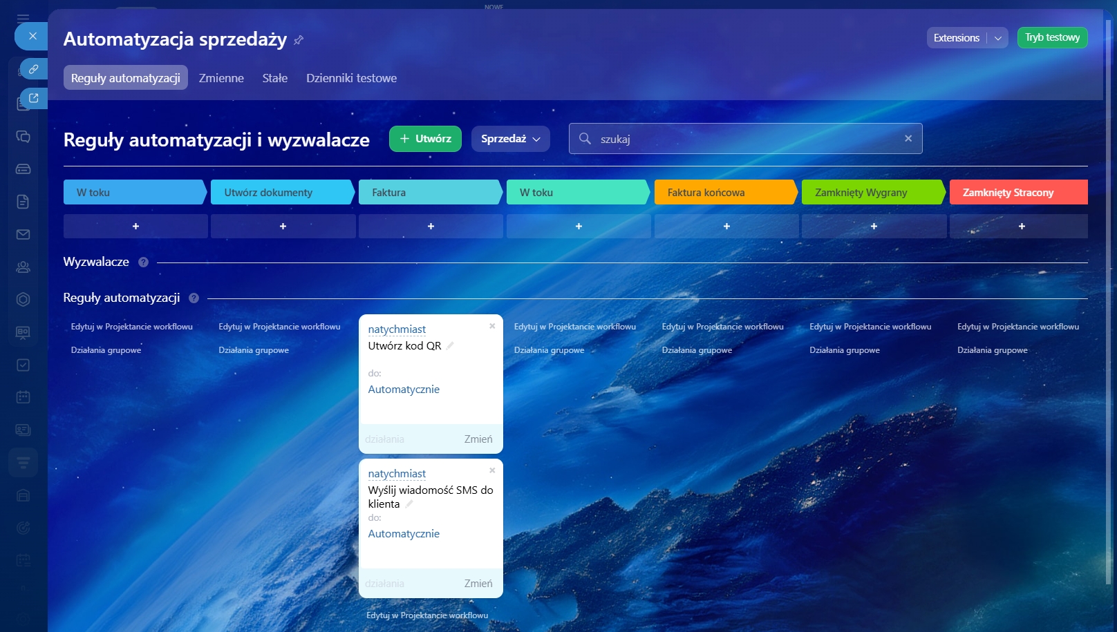 Przykład: Załóżmy, że organizujesz wydarzenie i chcesz wysyłać każdemu klientowi unikalny kod QR zamiast zwykłego biletu. Aby nie tworzyć go samodzielnie, możesz użyć regułę Utwórz kod QR, który utworzy kod, a reguła Wyślij SMS do klienta wyśle kod do klienta.