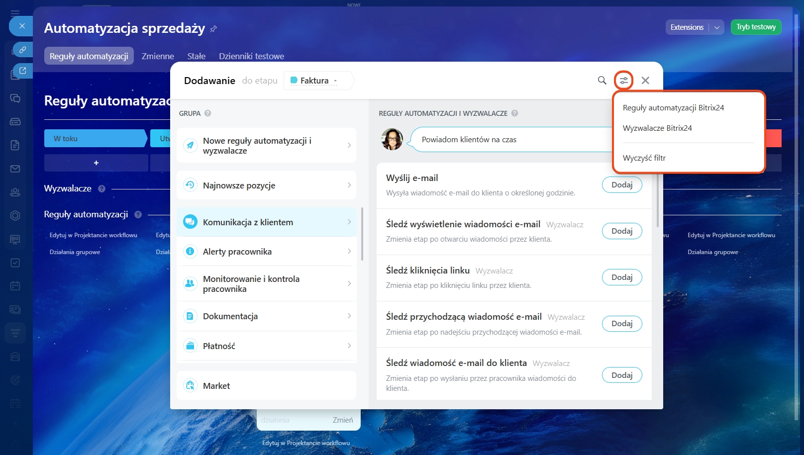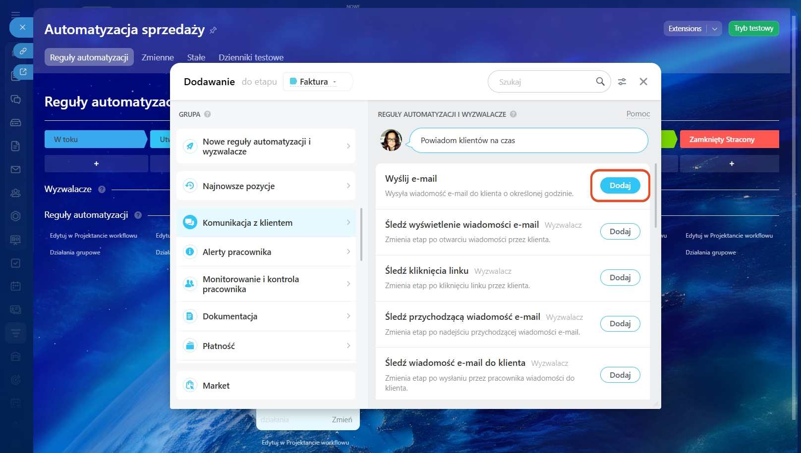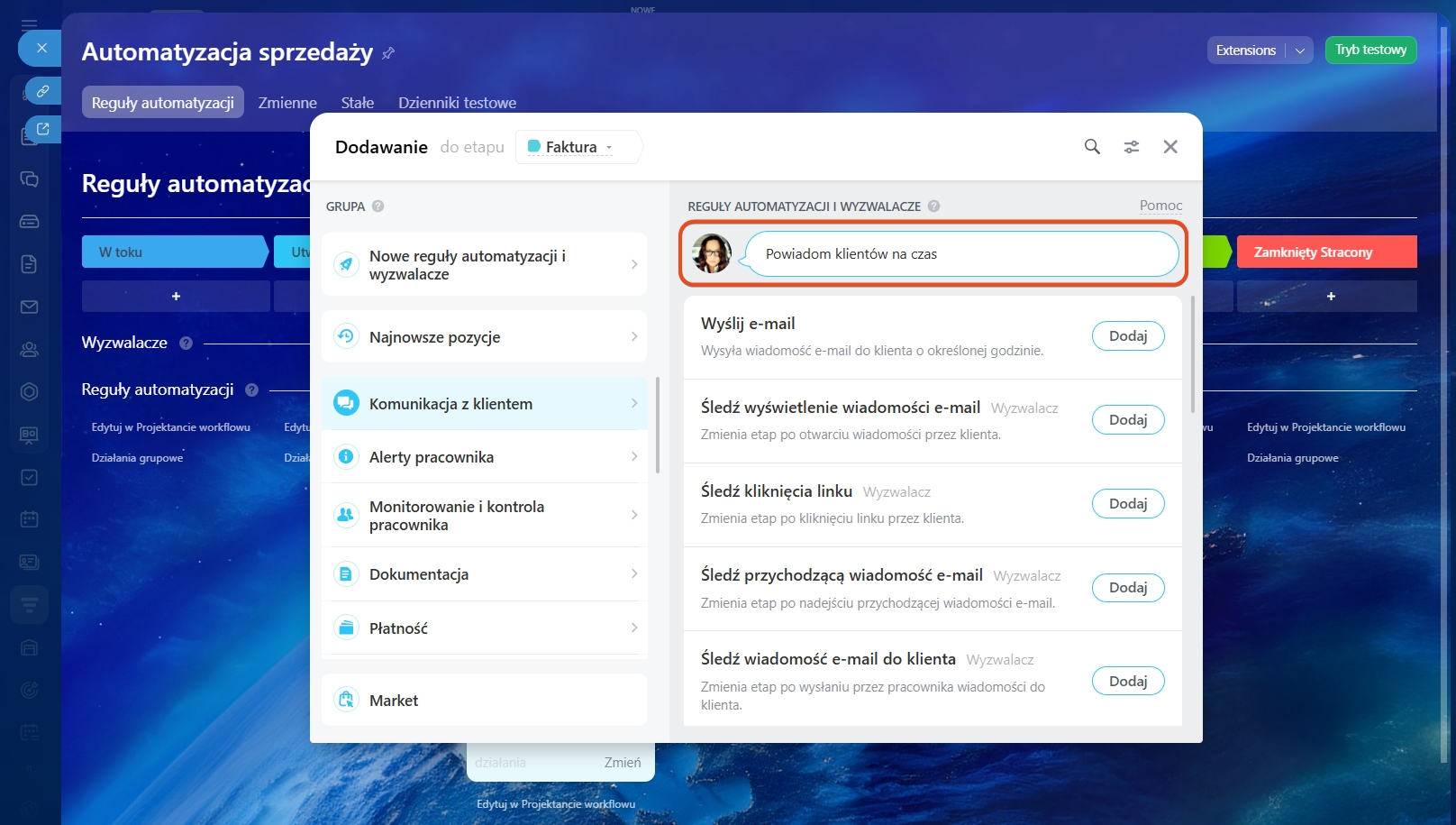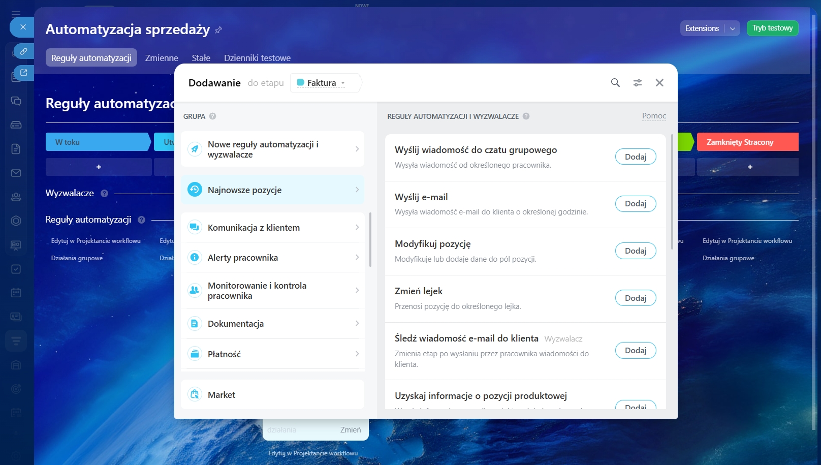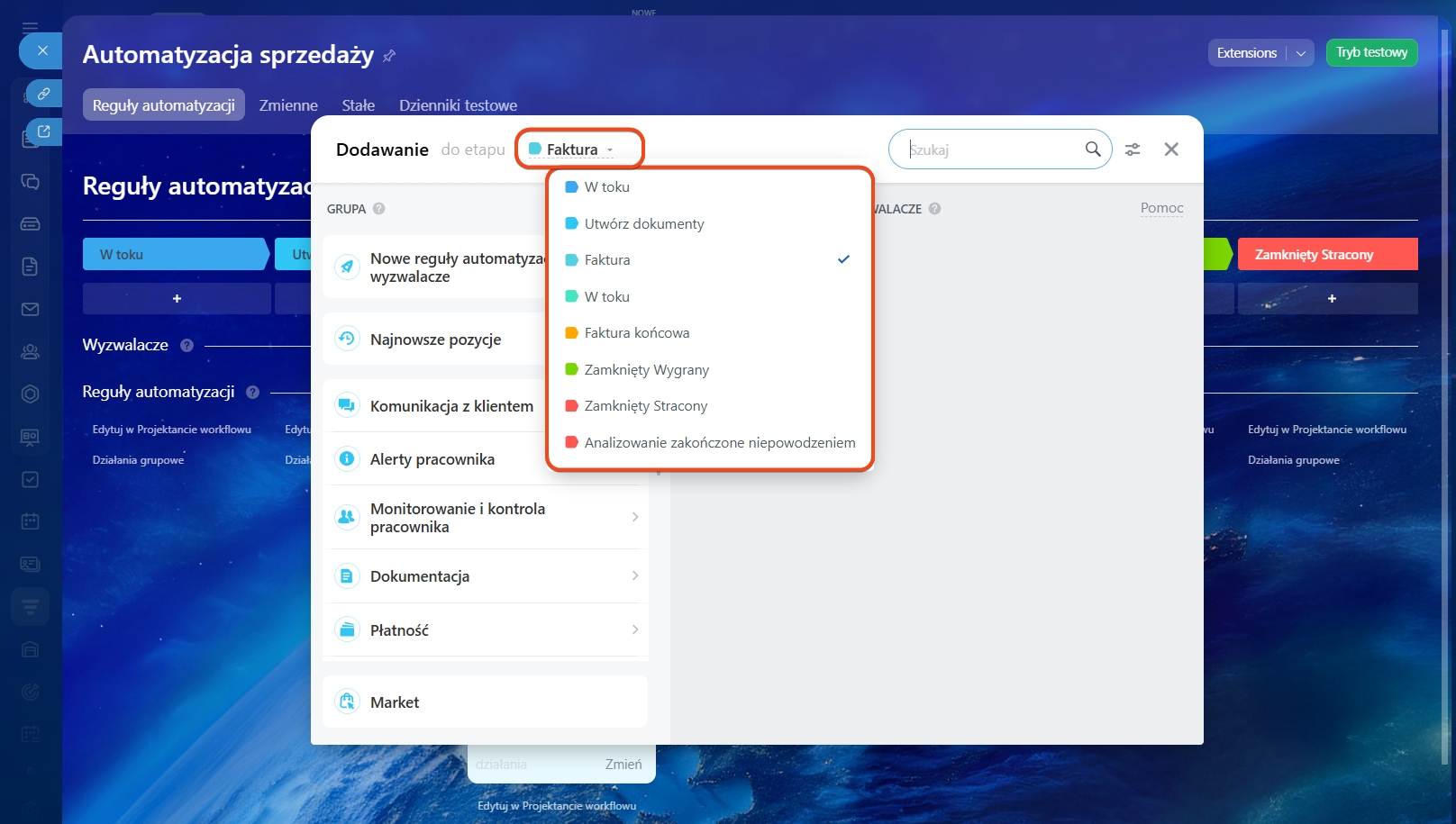 Możesz wybrać etap, dla którego chcesz skonfigurować reguły automatyzacji i wyzwalacze.