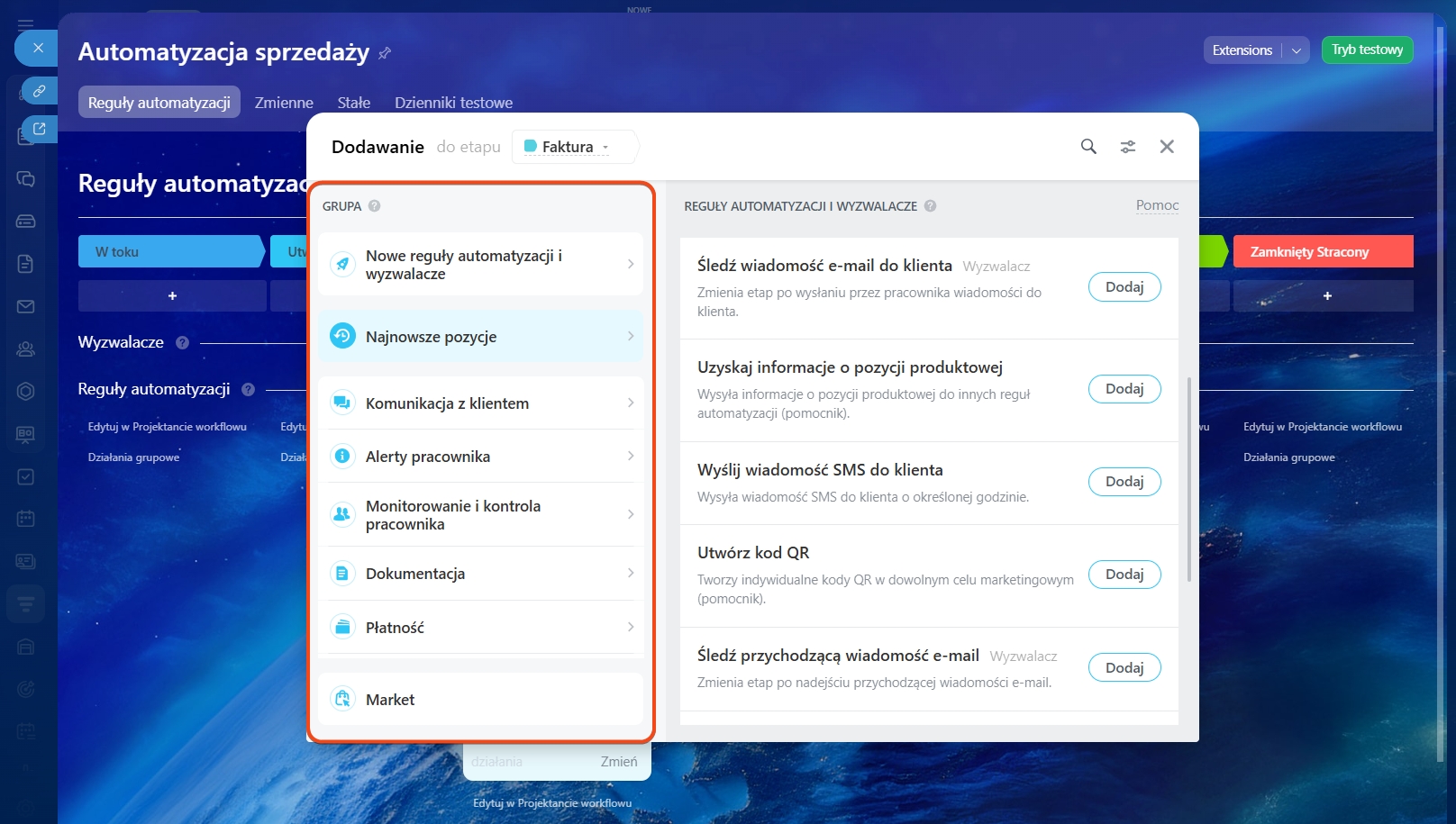 Aby dodać regułę, kliknij Dodaj. Najpierw wybierz reguły i wyzwalacze dla każdego etapu, a następnie przejdź do ich konfiguracji.