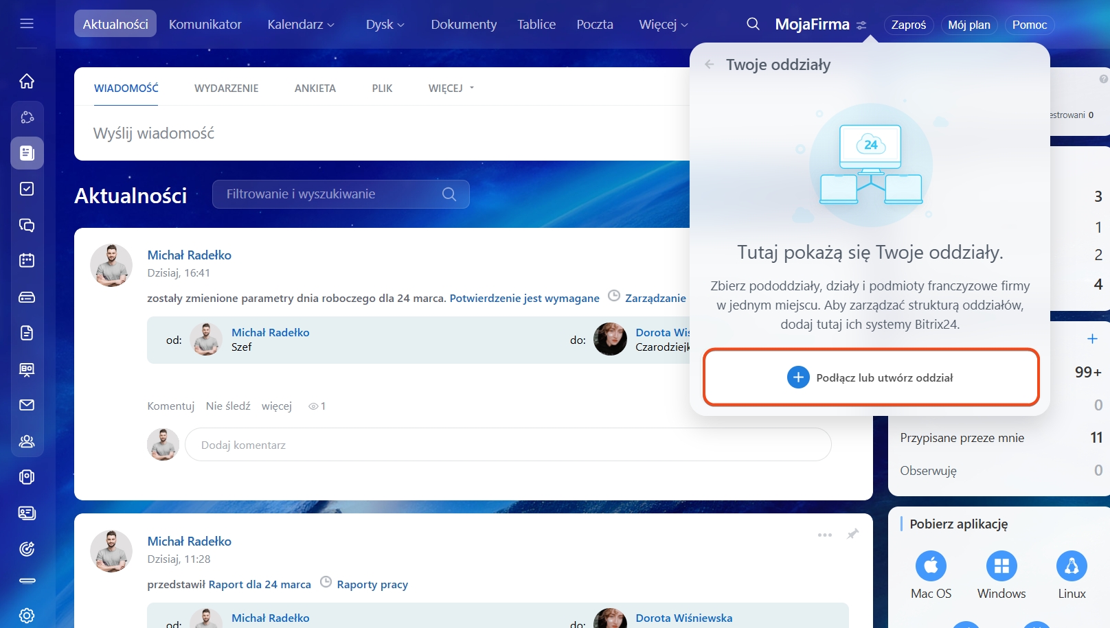 W głównym widżecie Bitrix24 kliknij przycisk Podłącz lub utwórz oddział.