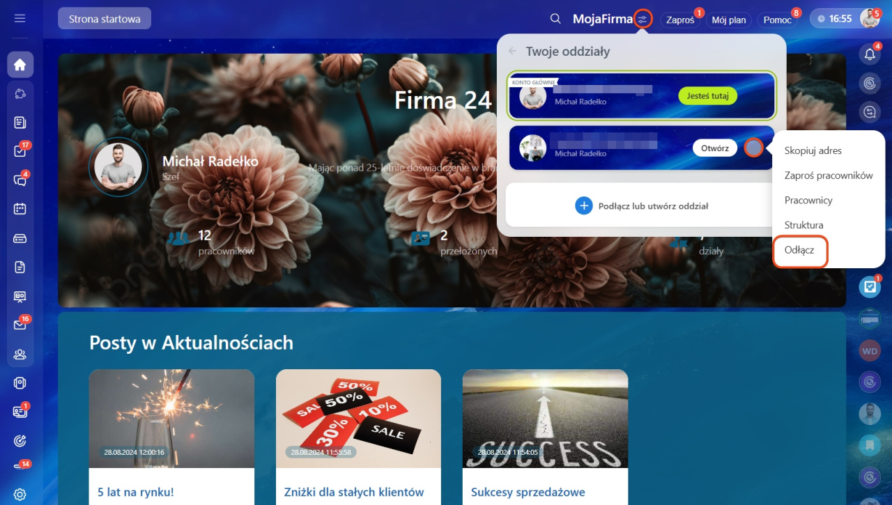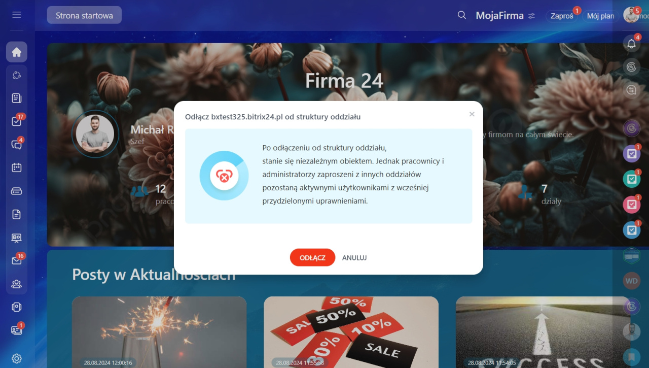 Aby odłączyć oddział, znajdź go w głównym widżecie Bitrix24 i wybierz opcję Odłącz w menu działań.