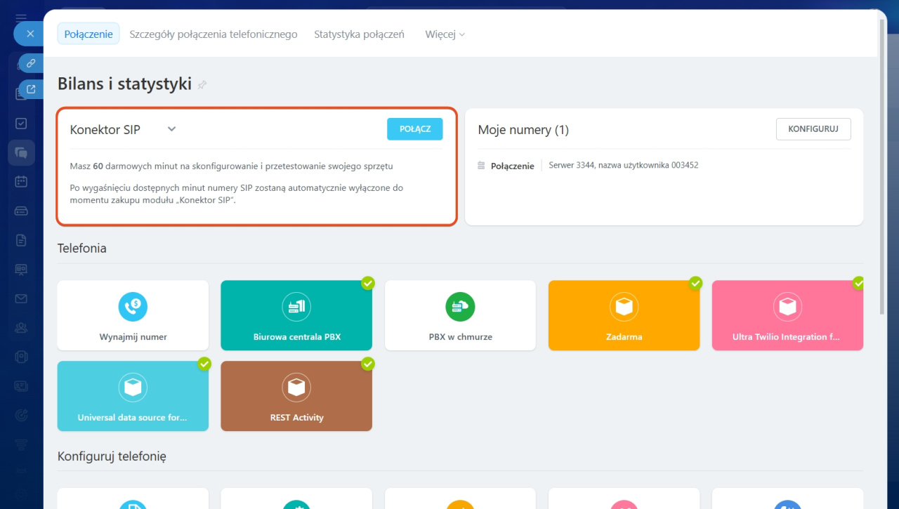 Aby móc odbierać połączenia w mobilnym CRM, Telefonia musi być podłączona przez SIP Connector.