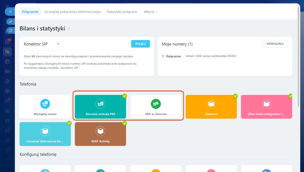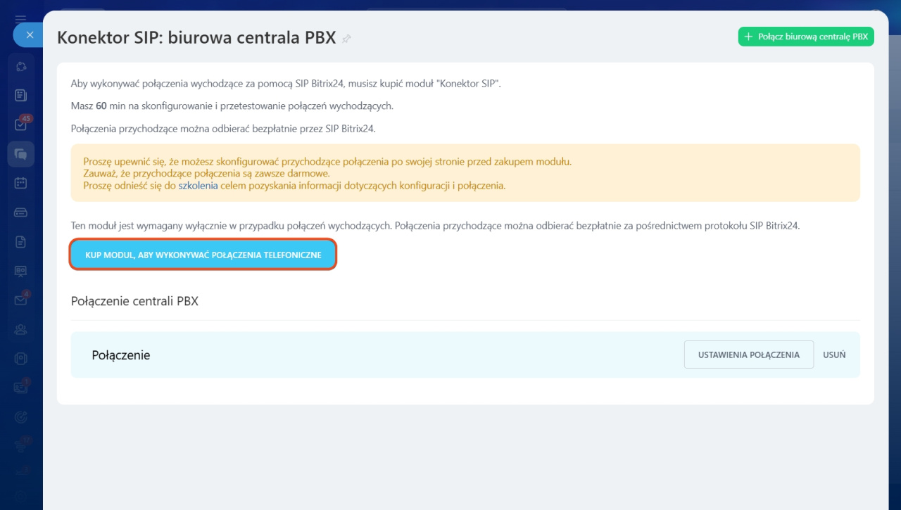 Aby zakupić subskrypcję SIP Connector, zaloguj się do swojego konta Bitrix24 i przejdź do sekcji Telefonia> Połączenie> Biurowa PBX/ PBX w chmurze.