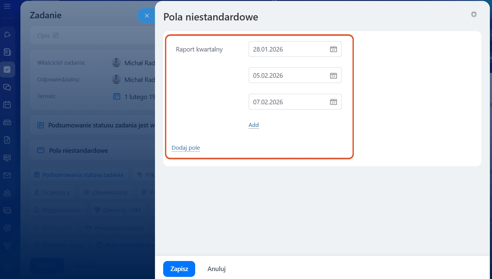 Pola niestandardowe umożliwiają dodanie do zadań dodatkowych danych, które są specyficzne tylko dla Twojej firmy.