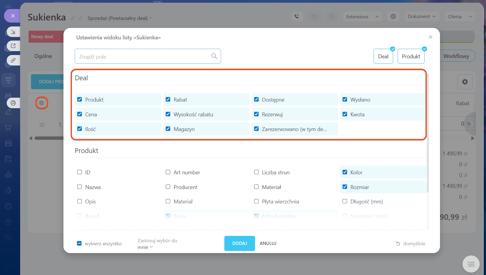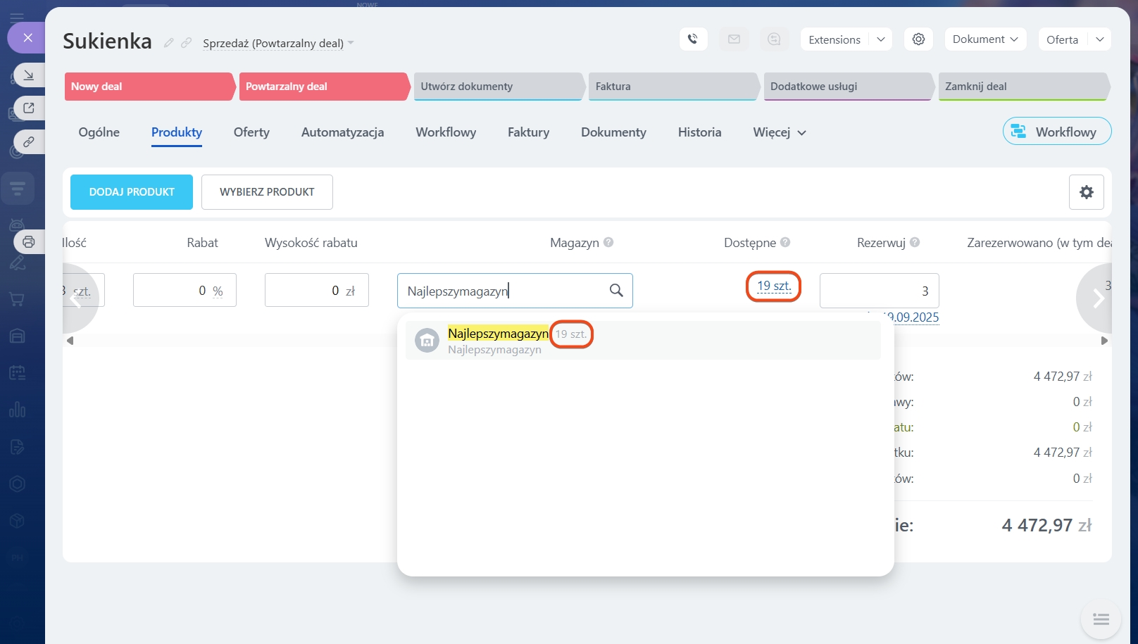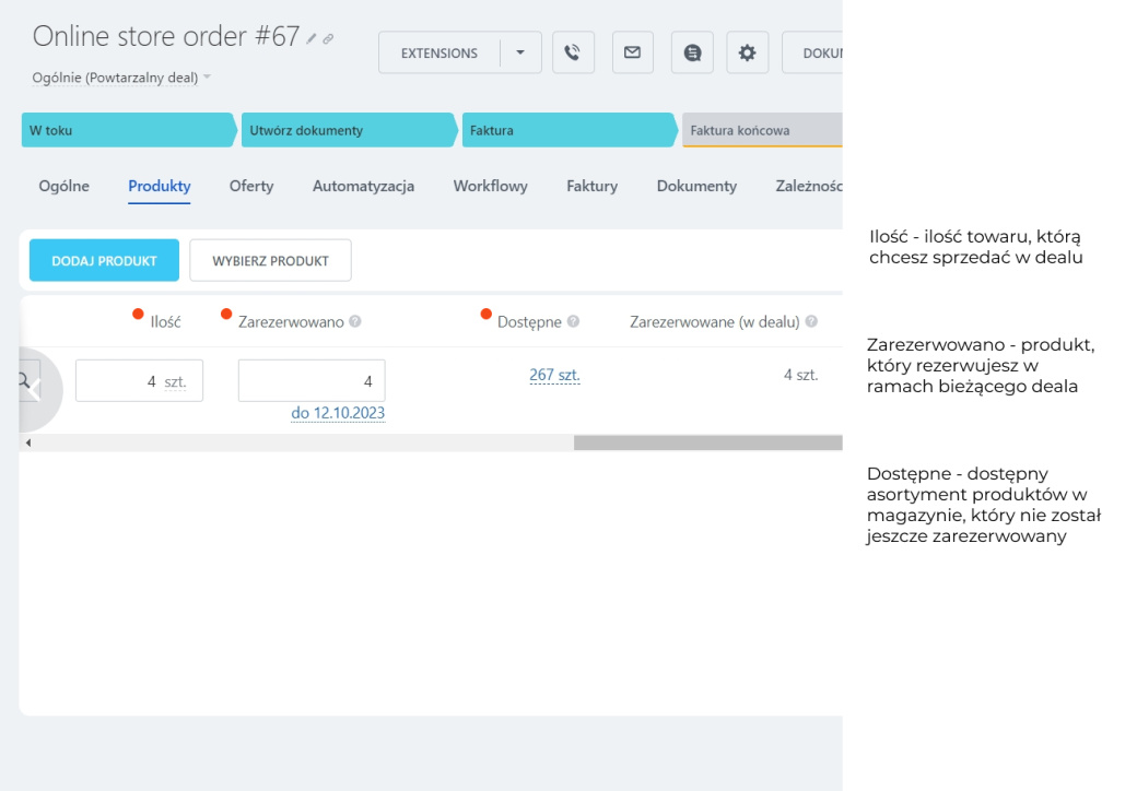 W polach Zarezerwowane (w dealu) i Wysłano zobaczysz liczbę produktów zarezerwowanych w dealu i liczbę produktów wysłanych do klienta.