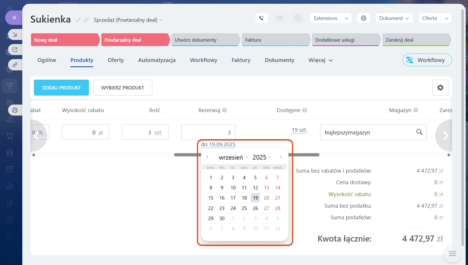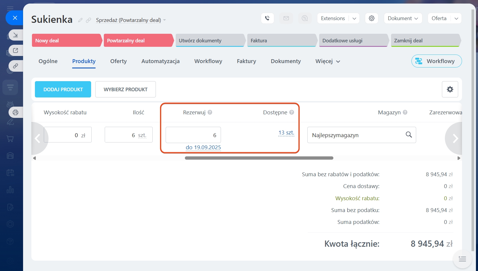 Domyślnie produkt w dealu jest rezerwowany automatycznie. Jeśli wskazałeś, że sprzedajesz pięć produktów, ta sama ilość zostanie zarezerwowana.