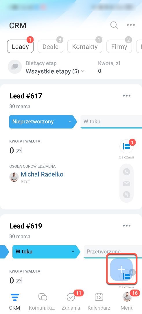 Aby dodać komentarz, ustawić zadanie, wysłać SMS i nie tylko, kliknij Plus (+) w sekcji Oś czasu.