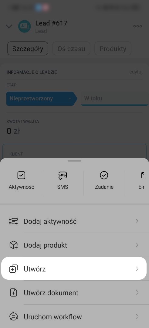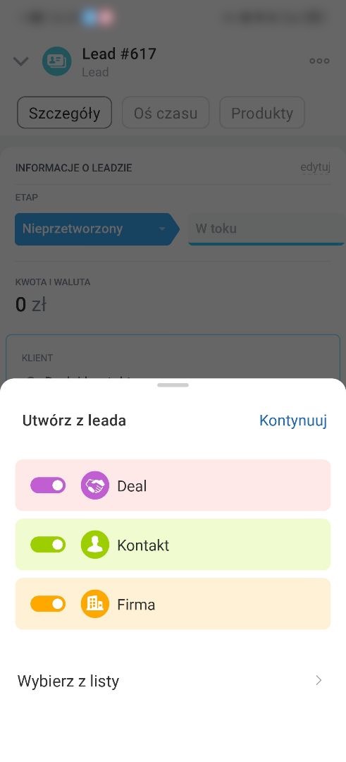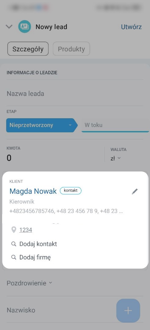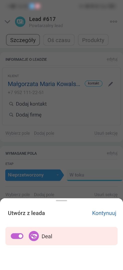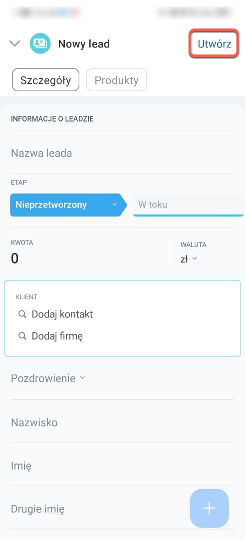 Możesz przekonwertować lead na deal, kontakt i firmę. Otwórz sekcję Szczegóły, kliknij Plus (+) > Utwórz.