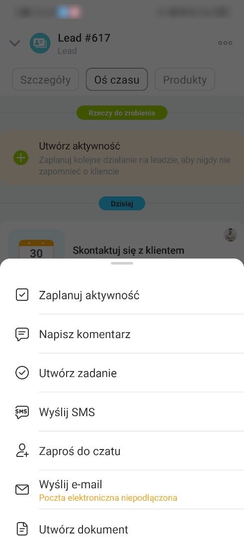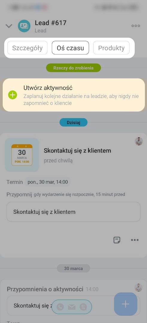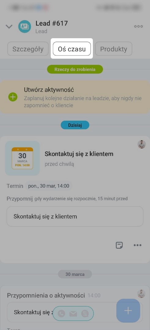 Możesz utworzyć aktywność na osi czasu, aby nie zapomnieć o kliencie: przypomnieć o połączeniu lub przygotować dokumenty.